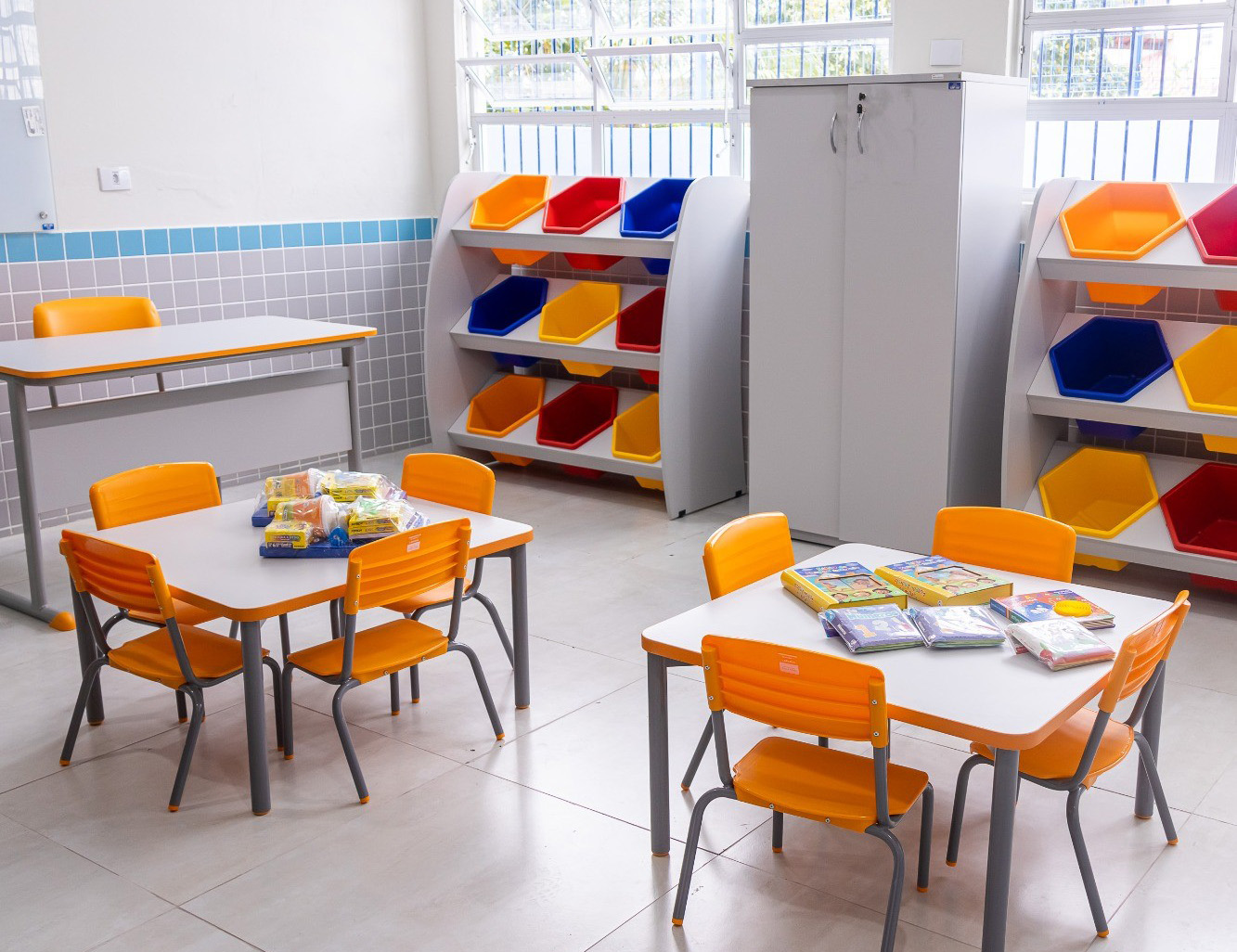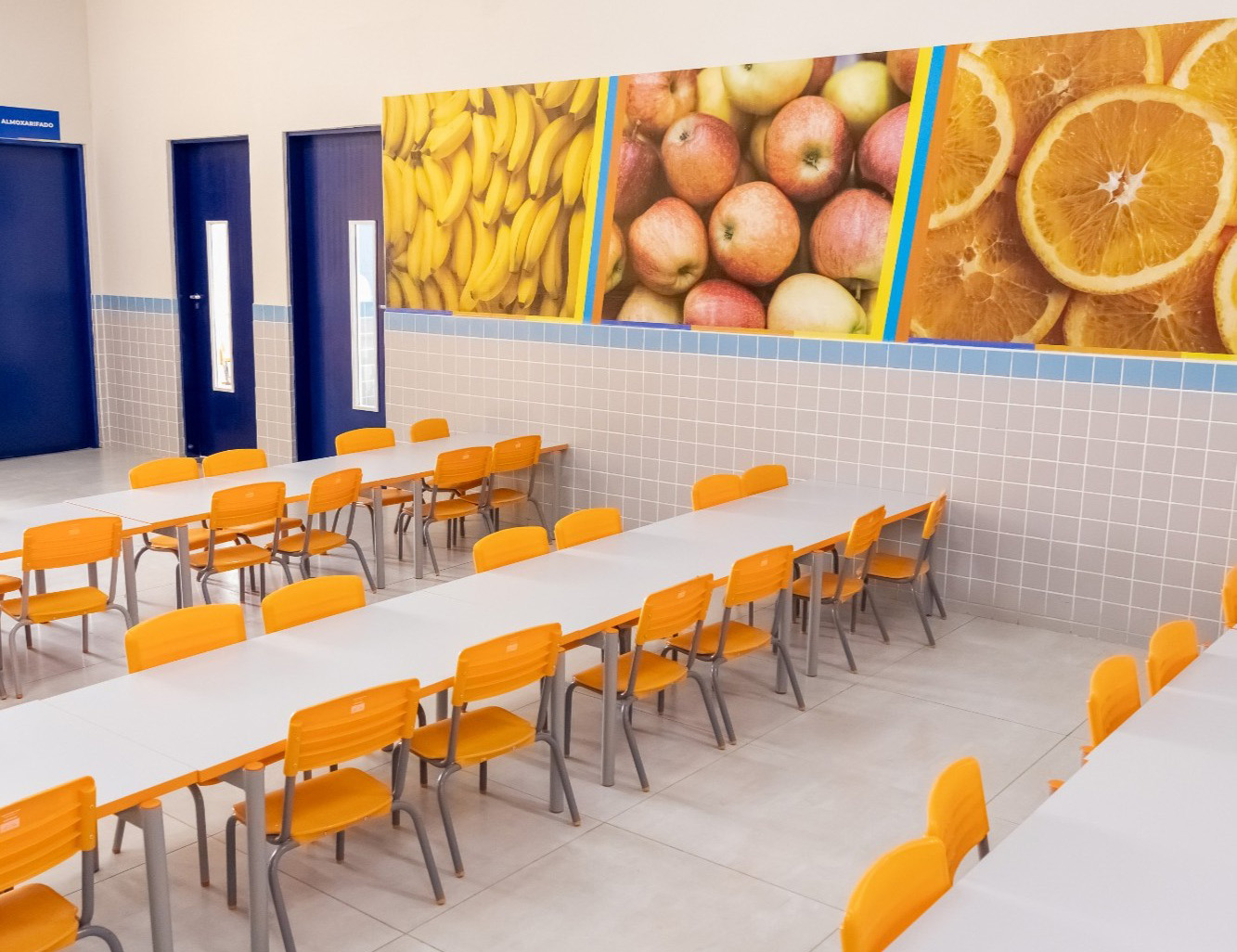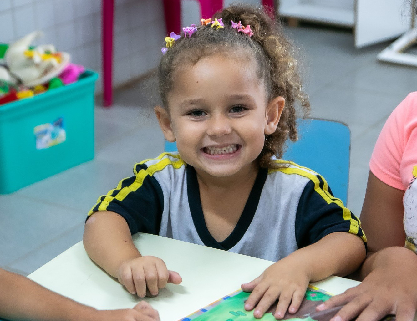 #PraTodosVerem: Conjunto de quatro fotos de uma creche escolar, destacando uma menina sorridente sentada à mesa e ambientes internos amplos, organizados e coloridos. As salas de aula e o berçário possuem mesas brancas com cadeiras amarelas, estantes com nichos coloridos e pisos emborrachados, enquanto o refeitório exibe painéis vibrantes de frutas como bananas, maçãs e laranjas. A estrutura é moderna, com paredes de azulejos claros e detalhes em azul, transmitindo um clima acolhedor de aprendizado e cuidado infantil. Fim da descrição.