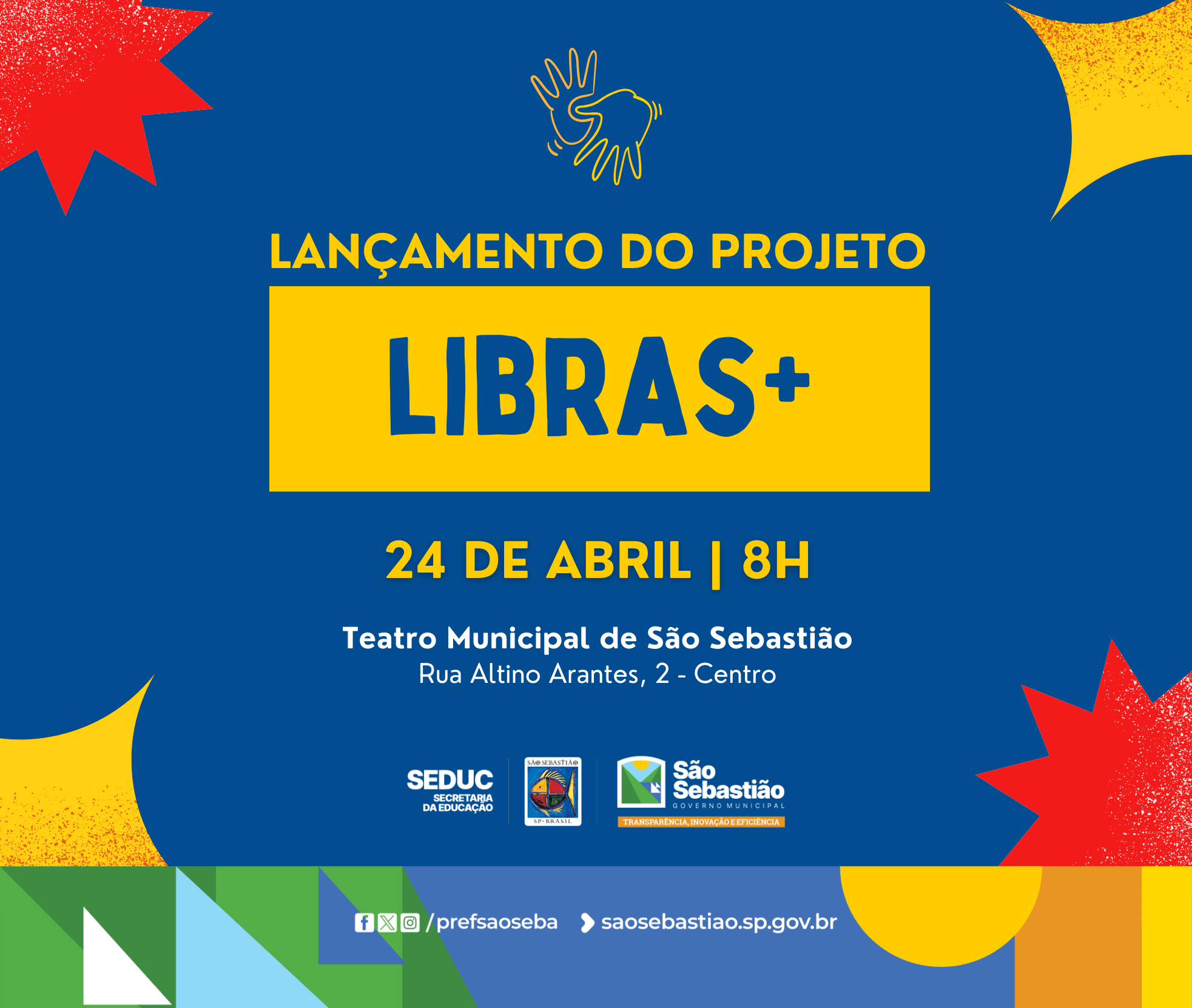 #PraTodosVerem: arte gráfica nas cores azul, amarelo e vermelho com elementos gráficos coloridos nas bordas. Ao centro, em destaque, está escrito “Lançamento do Projeto LIBRAS+ – 24 de abril | 8h” em letras amarelas. Abaixo, o local do evento: Teatro Municipal de São Sebastião, Rua Altino Arantes, 2 – Centro. Na parte inferior, estão os logos da SEDUC, da Prefeitura de São Sebastião e o endereço eletrônico da prefeitura. Em seguida, fotos ilustrativas de pessoas aprendendo Libras. Fim da descrição.