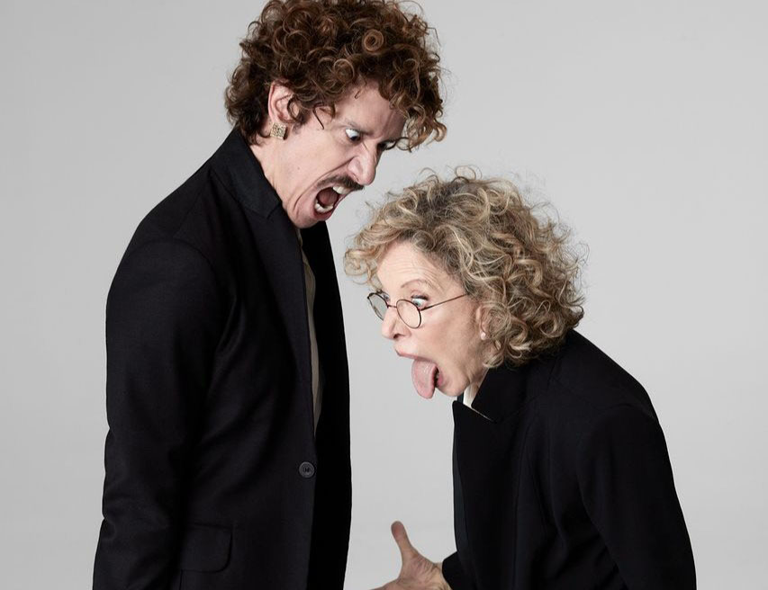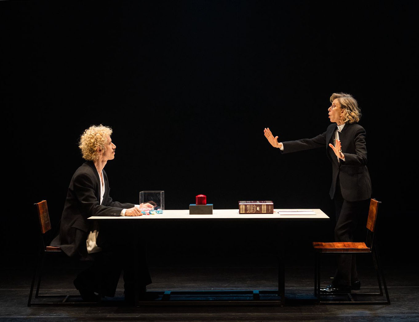 #PraTodosVerem: Sequência de imagens de um espetáculo teatral. Em fundo neutro e depois em palco escuro, Marília Gabriela e Theodoro Cochrane vestidos com figurinos sociais pretos, aparecem em cenas expressivas. Em uma, fazem caretas exageradas frente a frente; em outra, estão em lados opostos de uma mesa com objetos cênicos, como um botão vermelho e livros, simulando um diálogo tenso; por fim, posam lado a lado, olhando para a câmera. O clima mistura humor, intensidade e dramaticidade. Fim da descrição.