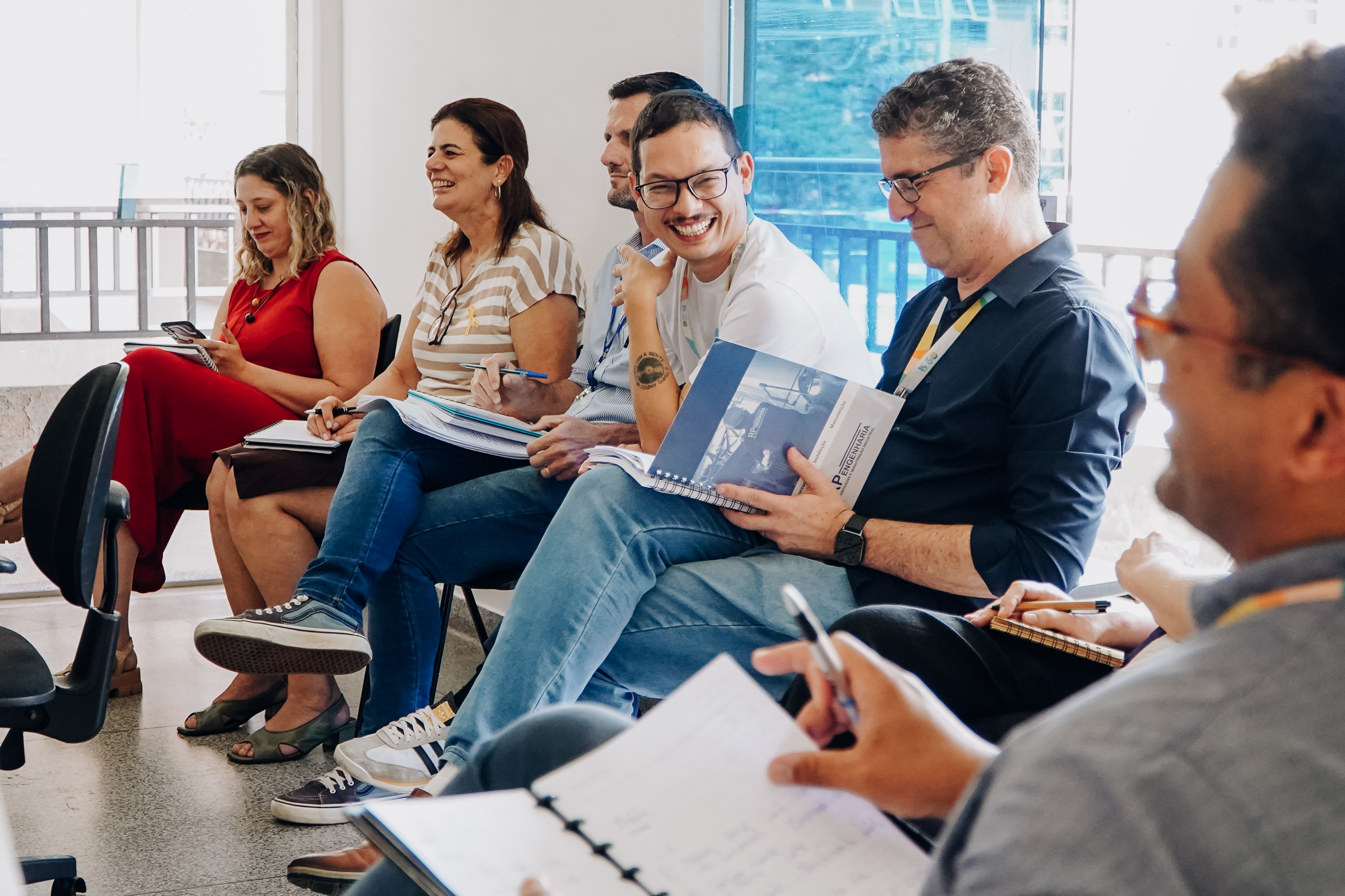 #PraTodosVerem: imagens da reunião, promovida pela Prefeitura de São Sebastião, com representantes das Unidades Regionais de Serviços de Abastecimento de Água Potável e Esgotamento Sanitário (URAE 1) e da empresa responsável pelo abastecimento de água potável e saneamento do município, a Companhia de Saneamento Básico do Estado de São Paulo (Sabesp). As fotos mostram um grupo pessoas em uma sala de reuniões, abordando diversos assuntos, em momentos de maior concentração e assuntos sérios, mas também em ocasiões de descontração e sorrisos. Fim da descrição.
