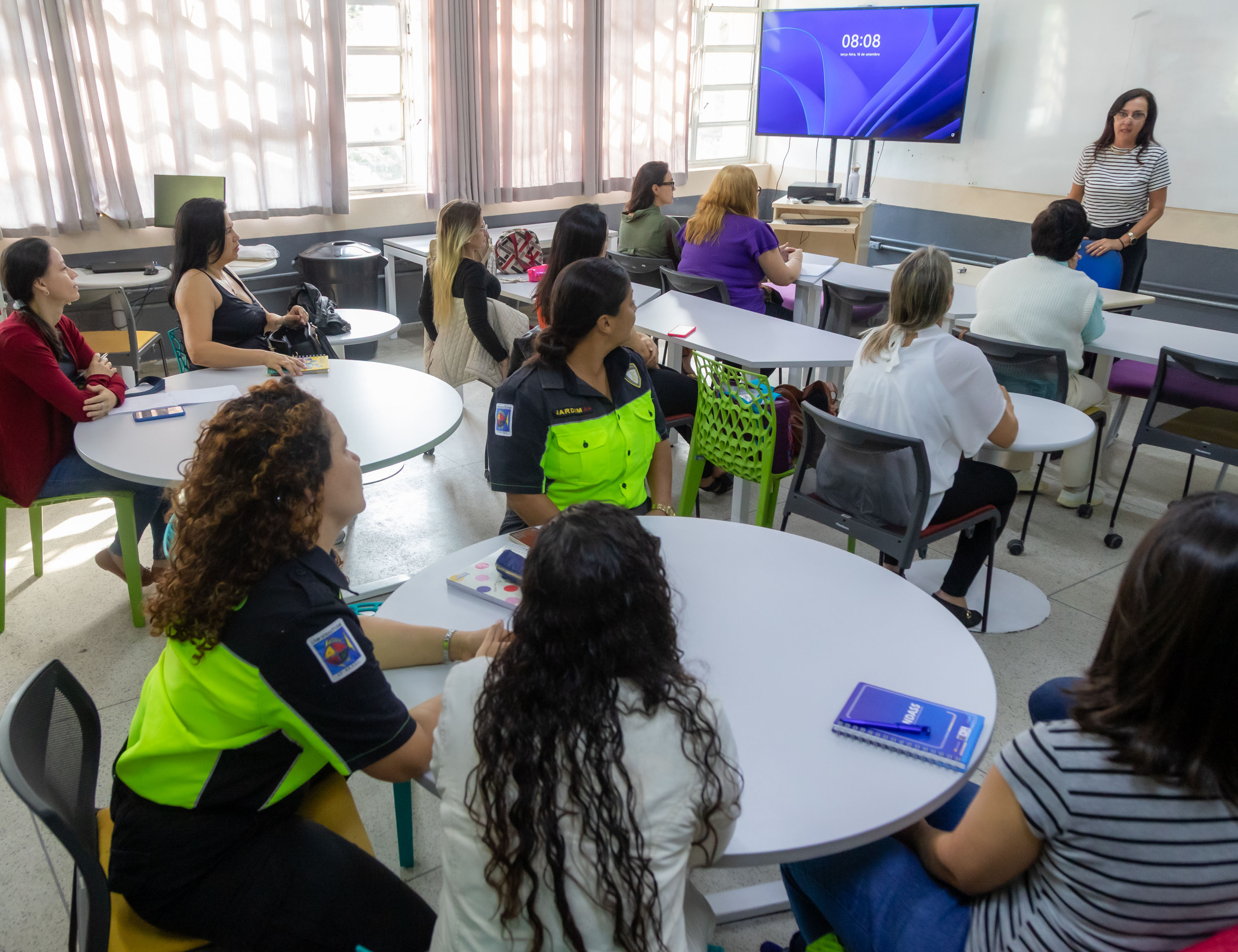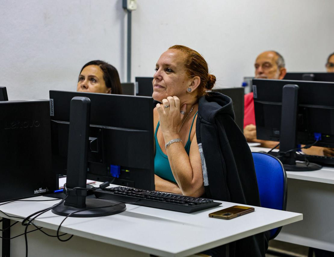 #PraTodosVerem: As imagens mostram salas de aula onde alunos participam de cursos de capacitação promovidos pela Prefeitura de São Sebastião. Em uma das fotos, pessoas estão reunidas em grupos, sentadas ao redor de mesas redondas, ouvindo uma mulher que fala próxima a um quadro branco e a uma televisão ligada. Nas demais imagens, alunos de diferentes idades assistem às aulas em laboratórios de informática, atentos aos computadores à frente e às explicações dos instrutores. O ambiente é bem iluminado e organizado, com cortinas e janelas amplas. Fim da descrição.