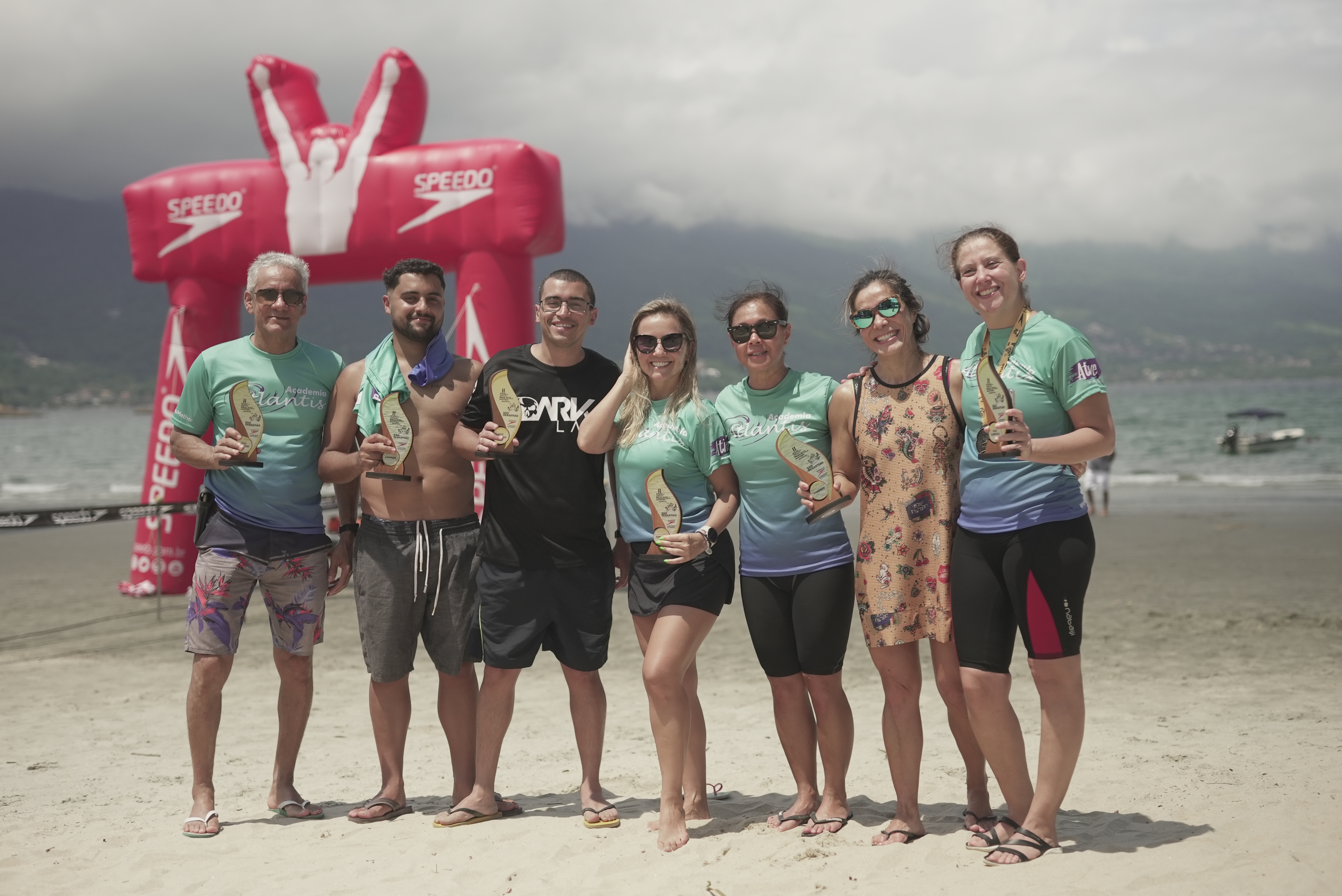 #PraTodosVerem: Atletas celebram momentos de vitória e confraternização durante etapas anteriores do Circuito Paulista de Maratonas Aquáticas, realizadas em São Sebastião. As imagens mostram competidores sorridentes exibindo troféus e medalhas, além de nadadores comemorando suas conquistas à beira-mar, simbolizando o espírito esportivo e a energia vibrante do evento. Fim da descrição.