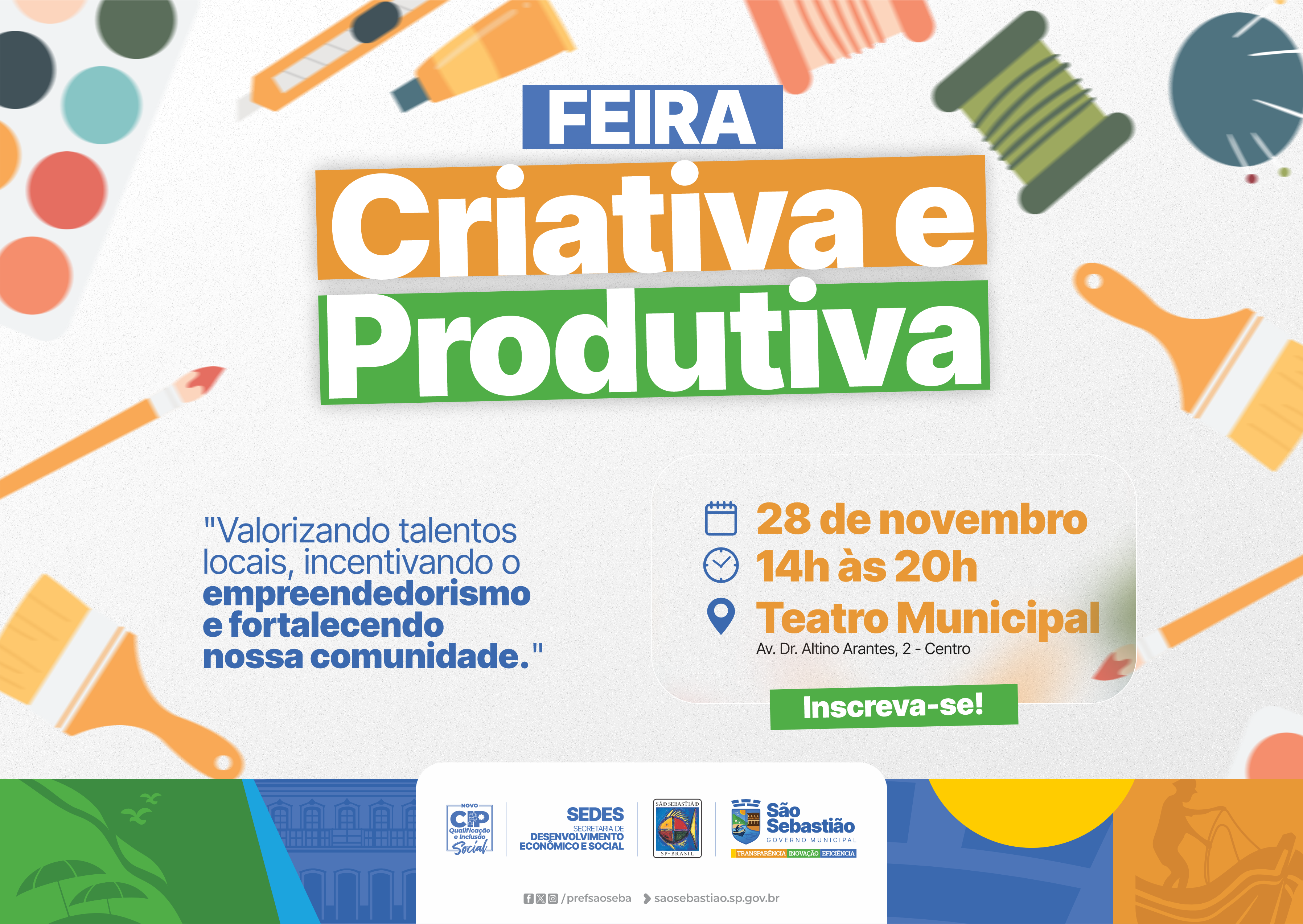 #PraTodosVerem: Card colorido divulga a Feira Criativa e Produtiva, com o texto principal em letras grandes nas cores azul, laranja, branca e verde. Abaixo, está a frase “Valorizando talentos locais, incentivando o empreendedorismo e fortalecendo nossa comunidade.” O card informa a data 28 de novembro, das 14h às 20h, no Teatro Municipal, localizado na Av. Dr. Altino Arantes, 2 – Centro. Um botão verde com o texto “Inscreva-se” aparece em destaque. O fundo traz ilustrações de materiais artísticos, como pincéis, tinta, carretéis e lápis coloridos. Na parte inferior, há os logotipos do CIP São Sebastião, SEDES, Prefeitura de São Sebastião e Governo Municipal. Fim da descrição.