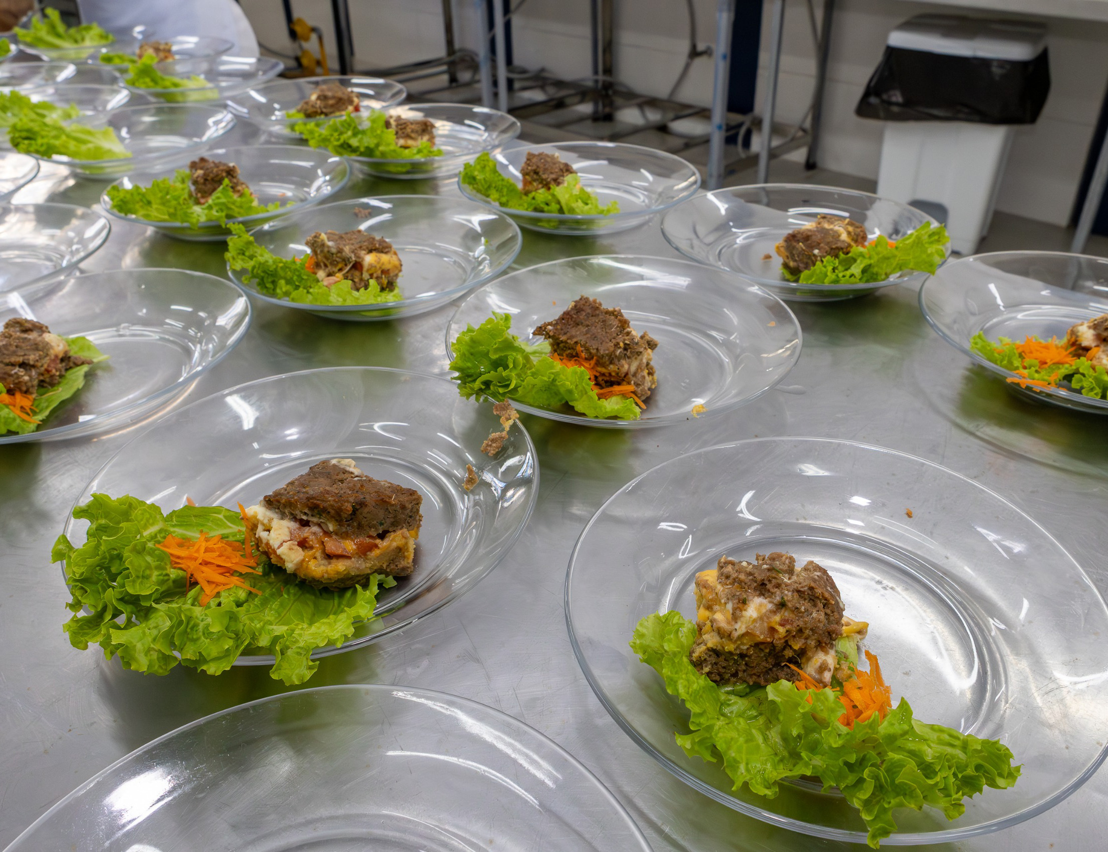 #PraTodosVerem: As imagens mostram uma ação em ambiente escolar, com estudantes e profissionais da alimentação. Na primeira foto, um grupo de alunos uniformizados, merendeiras com aventais coloridos e equipe escolar posam sorridentes para a câmera em frente a uma cozinha. As demais imagens mostram uma cozinheira uniformizada apresentando pratos prontos com alface, cenoura ralada e uma porção de carne, dispostos sobre uma bancada de inox. Em outra imagem, vários pratos iguais estão organizados na mesa. Por fim, alunos estão sentados em mesas cobertas com toalhas azuis, saboreando a refeição e sorrindo para a foto. Fim da descrição.