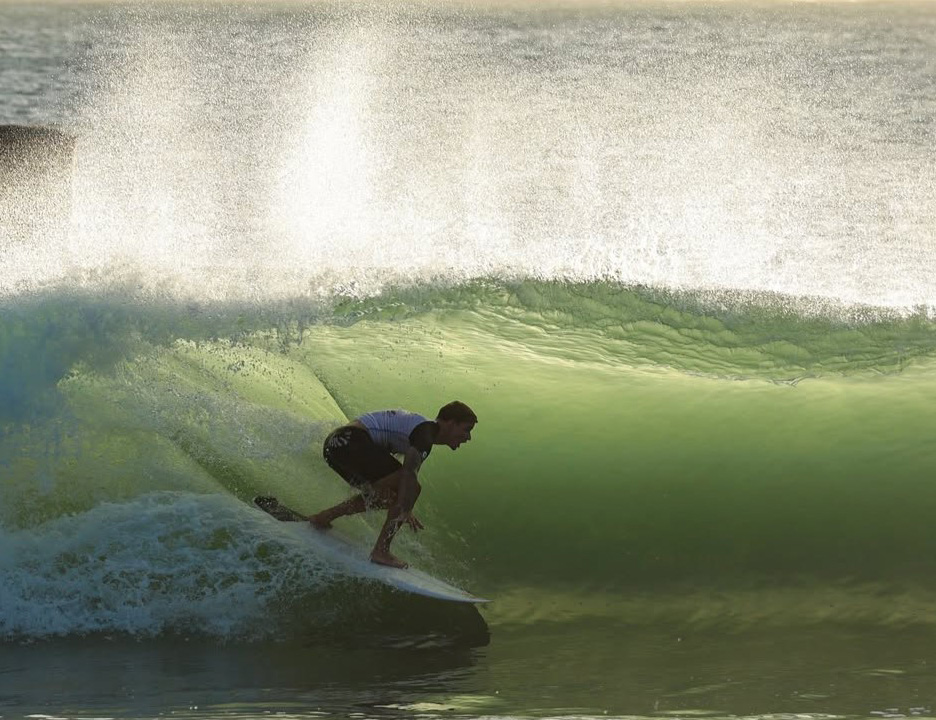 #PraTodosVerem: As imagens mostram surfistas deslizando por dentro de tubos cristalinos ao entardecer, com ondas verdes iluminadas pela luz baixa e borrifos brilhando contra o horizonte, enquanto ao final um atleta, ainda com a lycra de competição e segurando sua prancha, posa sorridente em frente ao mar segurando um troféu em formato de onda, celebrando sua performance no campeonato. Fim da descrição.