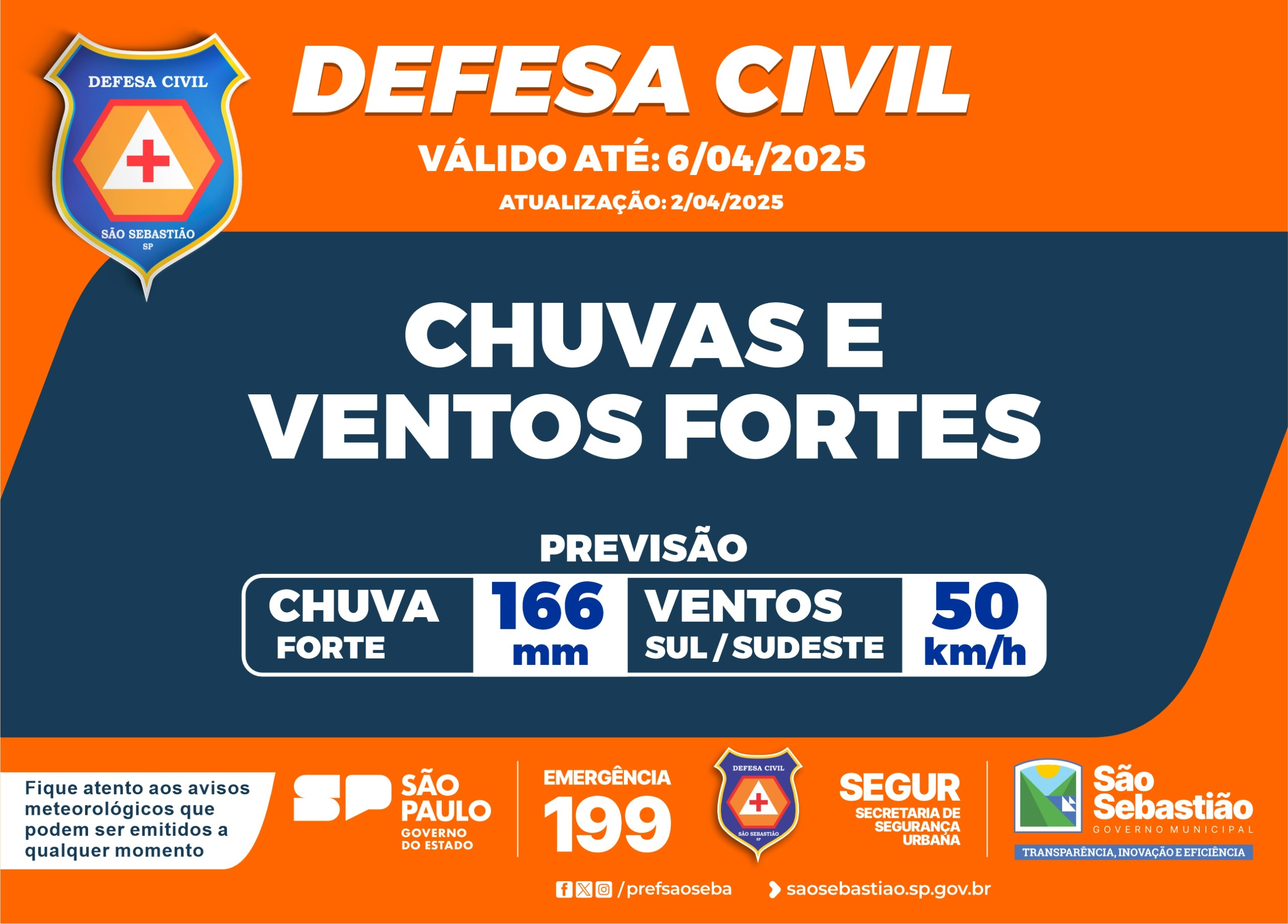 A Defesa Civil do Estado de São Paulo estendeu a operação 'SP Sempre Alerta Operação Chuvas' até o próximo dia 15 de abril. Originalmente prevista para encerrar no dia 31 de março, a ação seguirá até metade do próximo mês. Segundo a previsão dos meteorologistas do Centro de Gerenciamento de Emergências (CGE), há condição para chuvas intensas e ventos fortes, de até 50 quilômetros por horas, a partir de sexta-feira (4/4) até domingo (6/4), para todo o Litoral Norte.