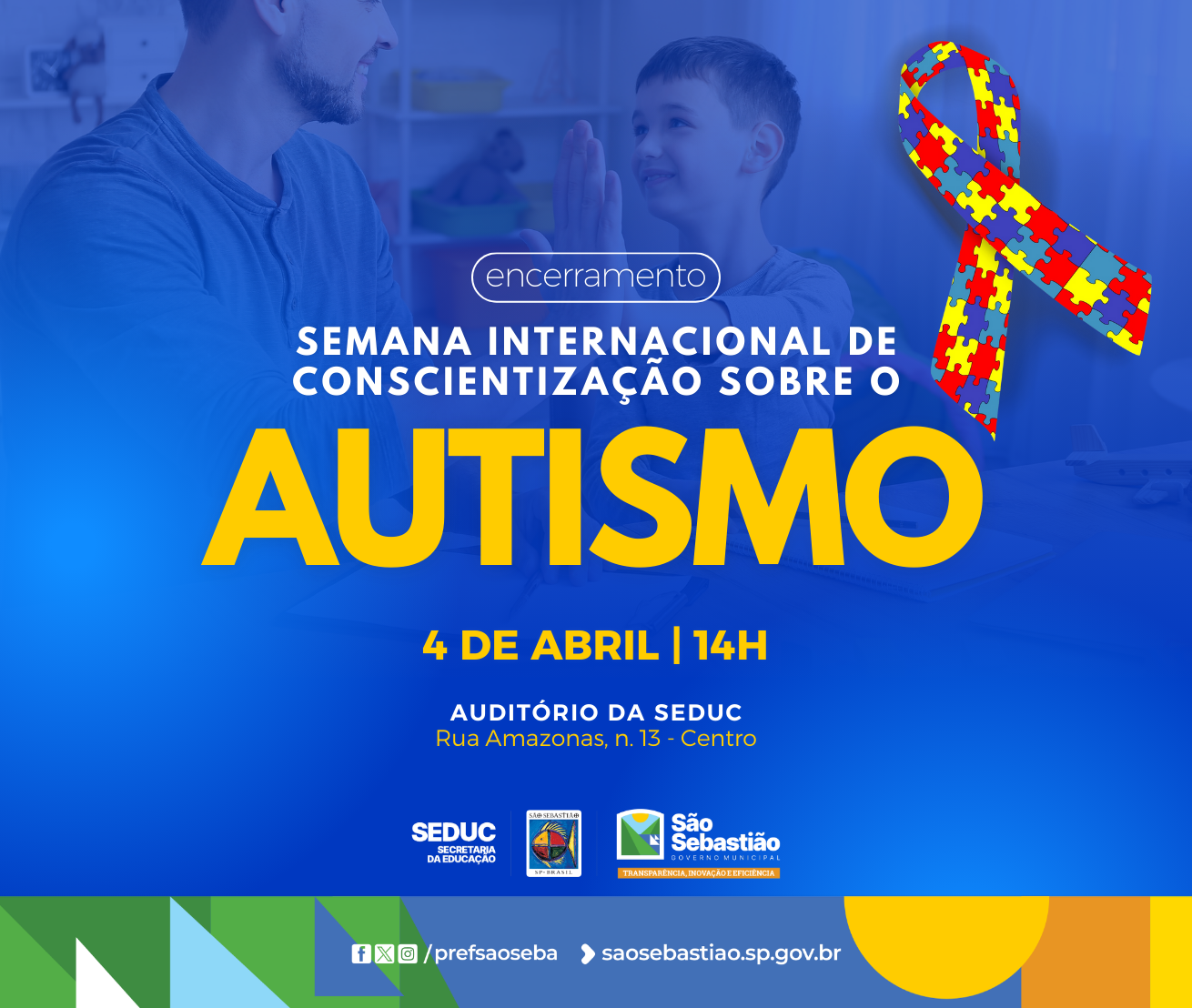 A Secretaria da Educação (Seduc) da Prefeitura de São Sebastião, juntamente com as secretarias de Desenvolvimento Econômico e Social (Sedes), da Pessoa com Deficiência e do Idoso (Sepedi), de Esportes (Seesp) e de Saúde (Sesau), além da Fundação Educacional e Cultural ‘Deodato Sant'Anna’ (Fundass), promoverá, nesta sexta-feira (4/4), o encerramento da Semana Nacional de Conscientização do Autismo. O evento será realizado às 14h, no auditório da Seduc, e contará com uma programação especial para reforçar a importância da inclusão e do atendimento especializado aos alunos com Transtorno do Espectro Autista (TEA).