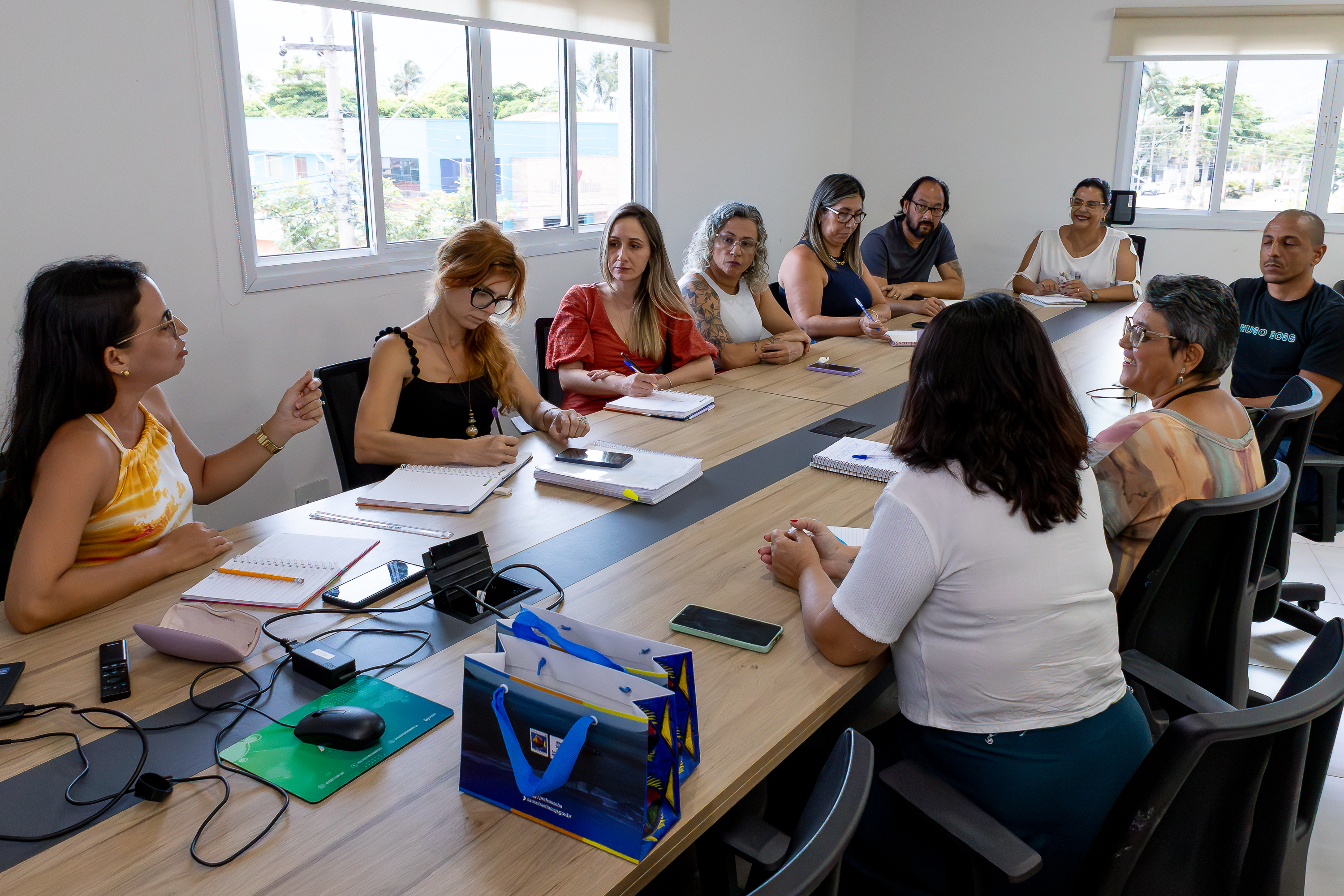#PraTodosVerem: sequência de fotos mostra momentos da reunião na sede da Secretaria da Educação de São Sebastião. Fim da descrição.
