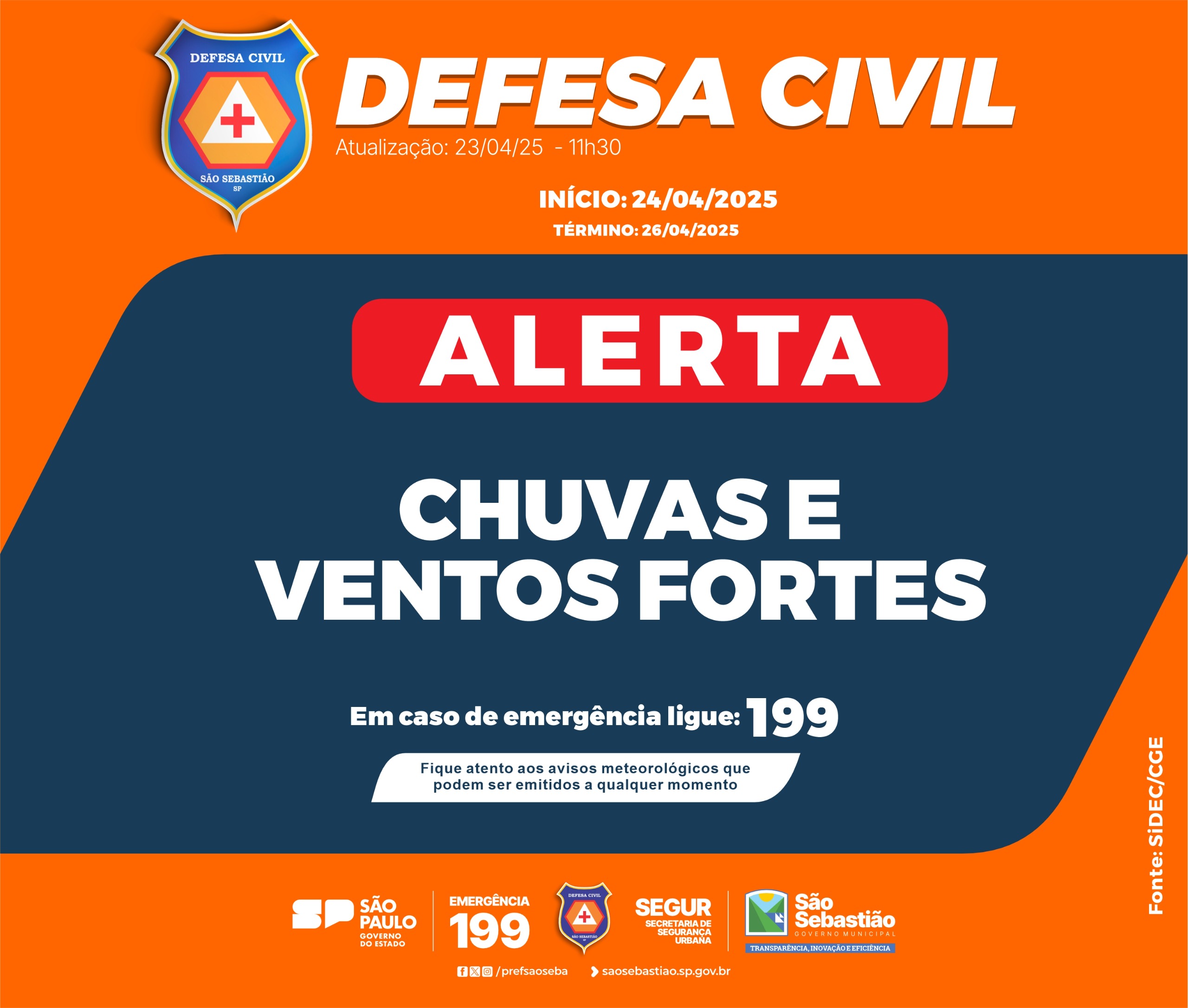 A Defesa Civil orienta que a população acompanhe os avisos oficiais e, em caso de emergência, acione o telefone 199.Outros contatos úteis incluem o Corpo de Bombeiros (193), Polícia Municipal (153), Polícia Militar (190) e o SAMU (192).