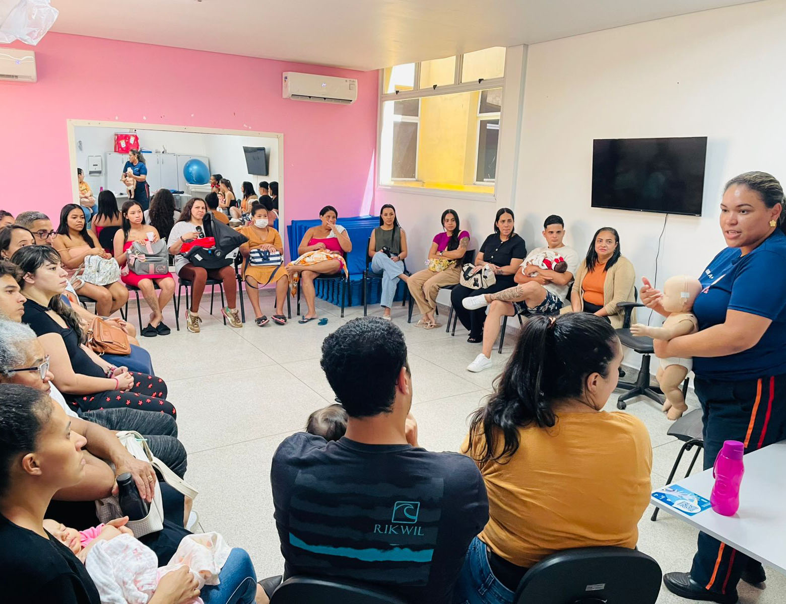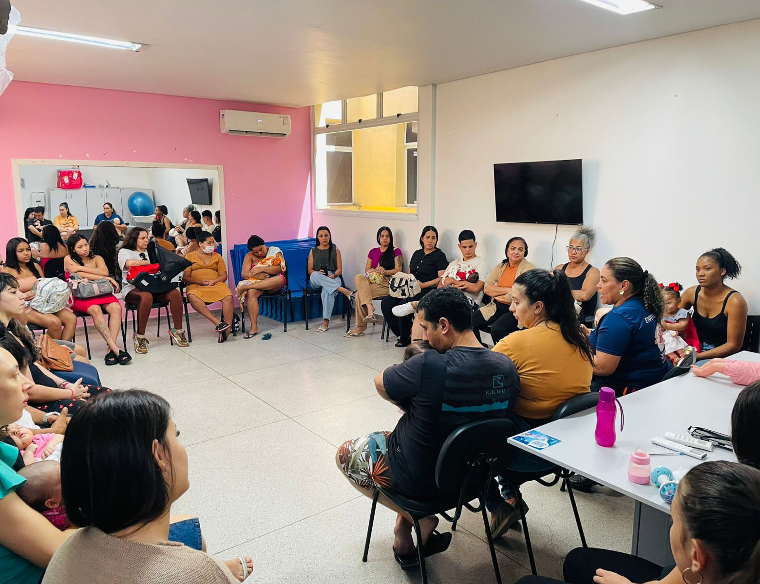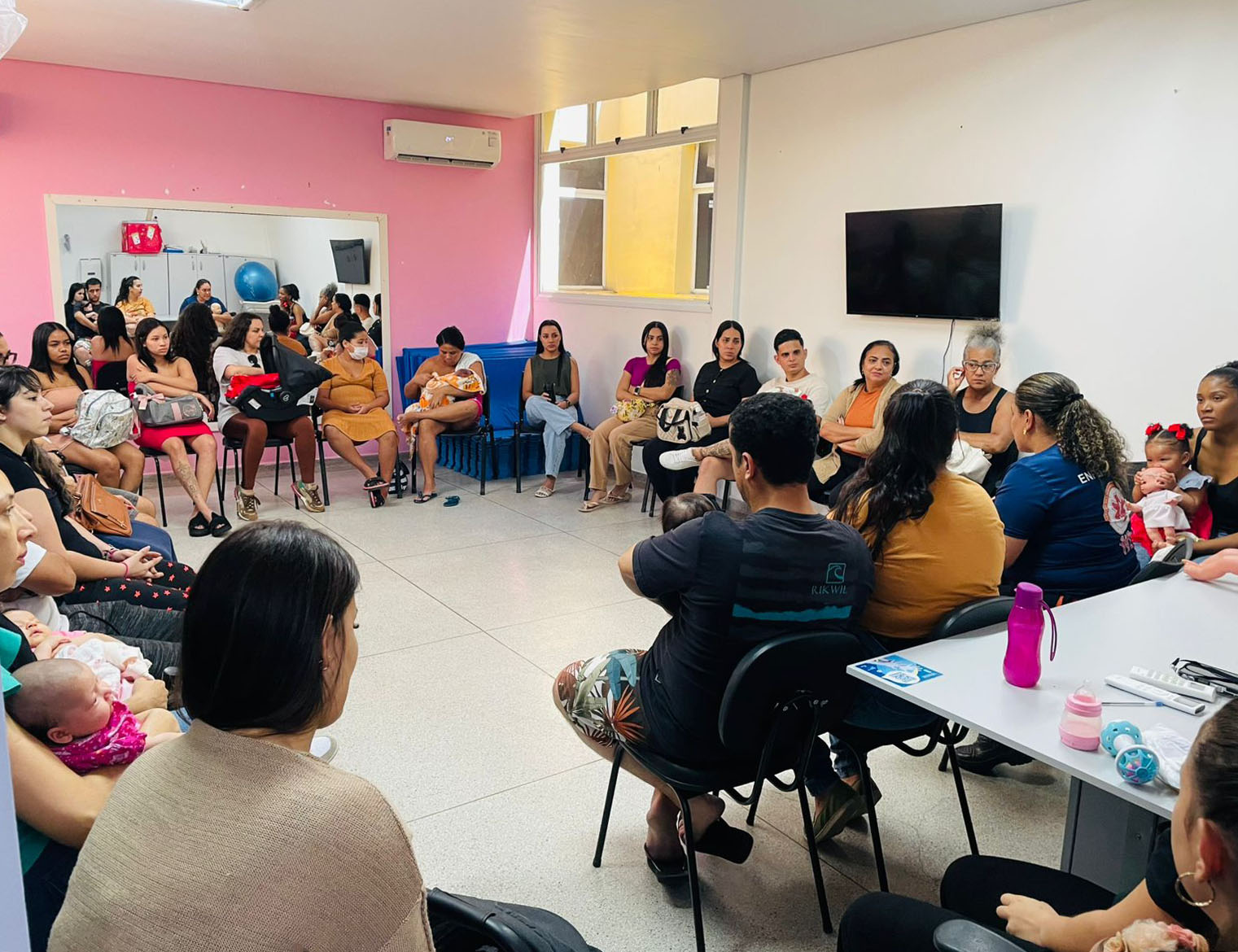 #PraTodosVerem: Imagem mostra roda de conversa com profissionais da saúde, mães e bebês, além de gestantes atentas, em uma sala ampla de paredes branca e rosa. Fim da descrição.