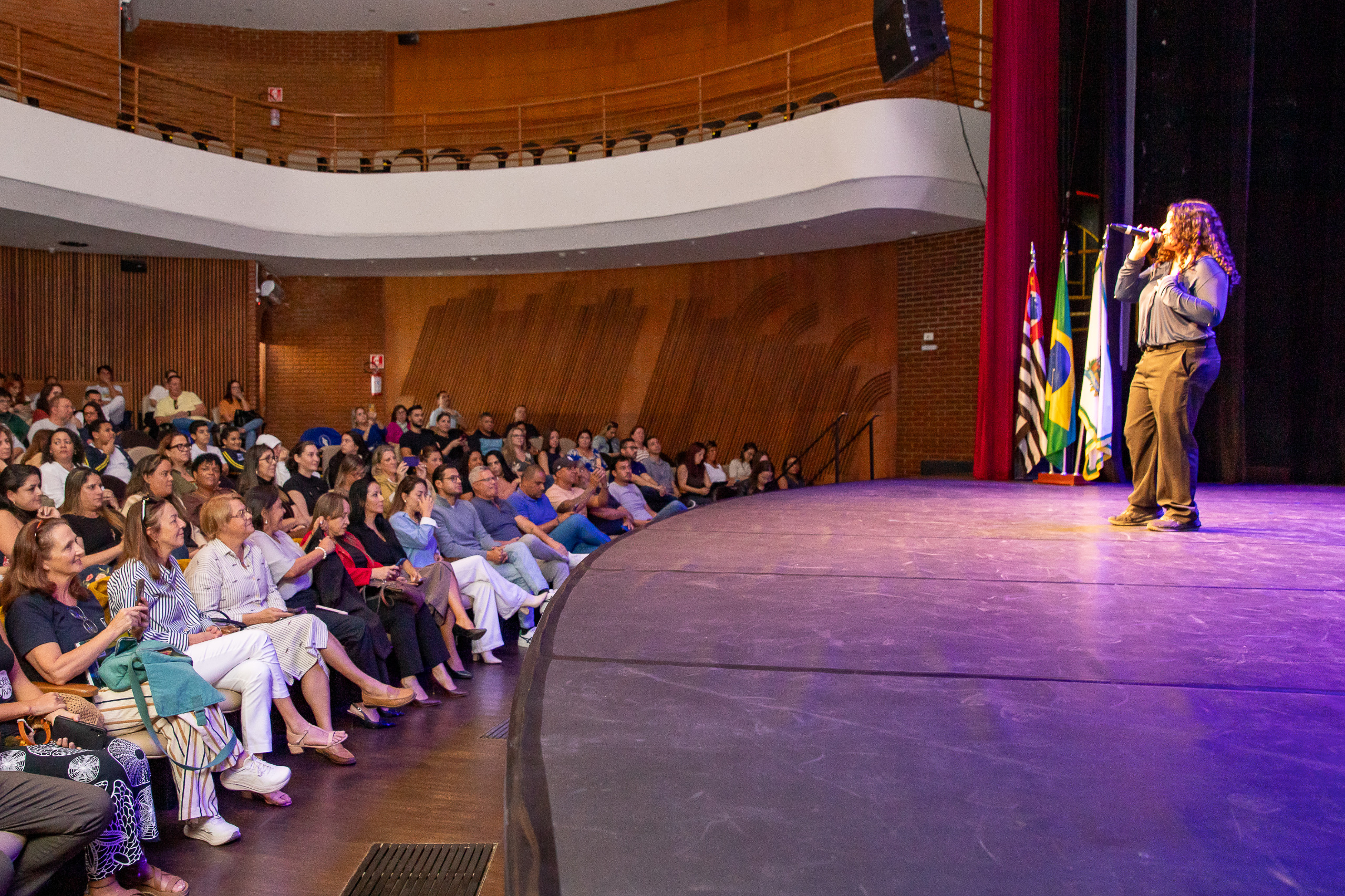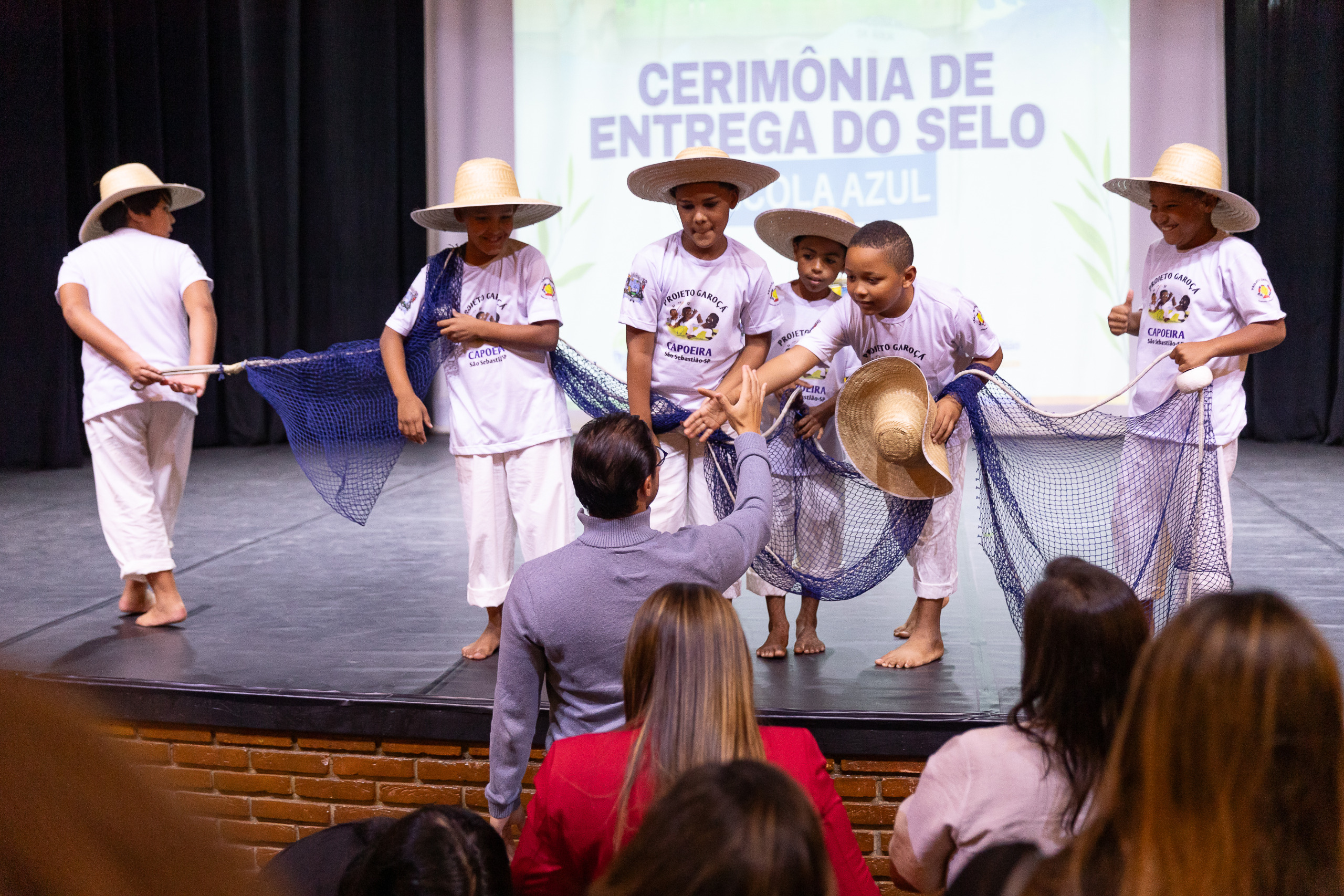 PraTodosVerem: imagens da cerimônia de entrega do Selo Escola Azul no Teatro Municipal de São Sebastião. Alunos e professores da rede municipal participam do evento com apresentações, homenagens e entrega simbólica das certificações. O público acompanha atento das poltronas do teatro, enquanto autoridades e representantes das instituições parceiras prestigiam a conquista. Fim da descrição.