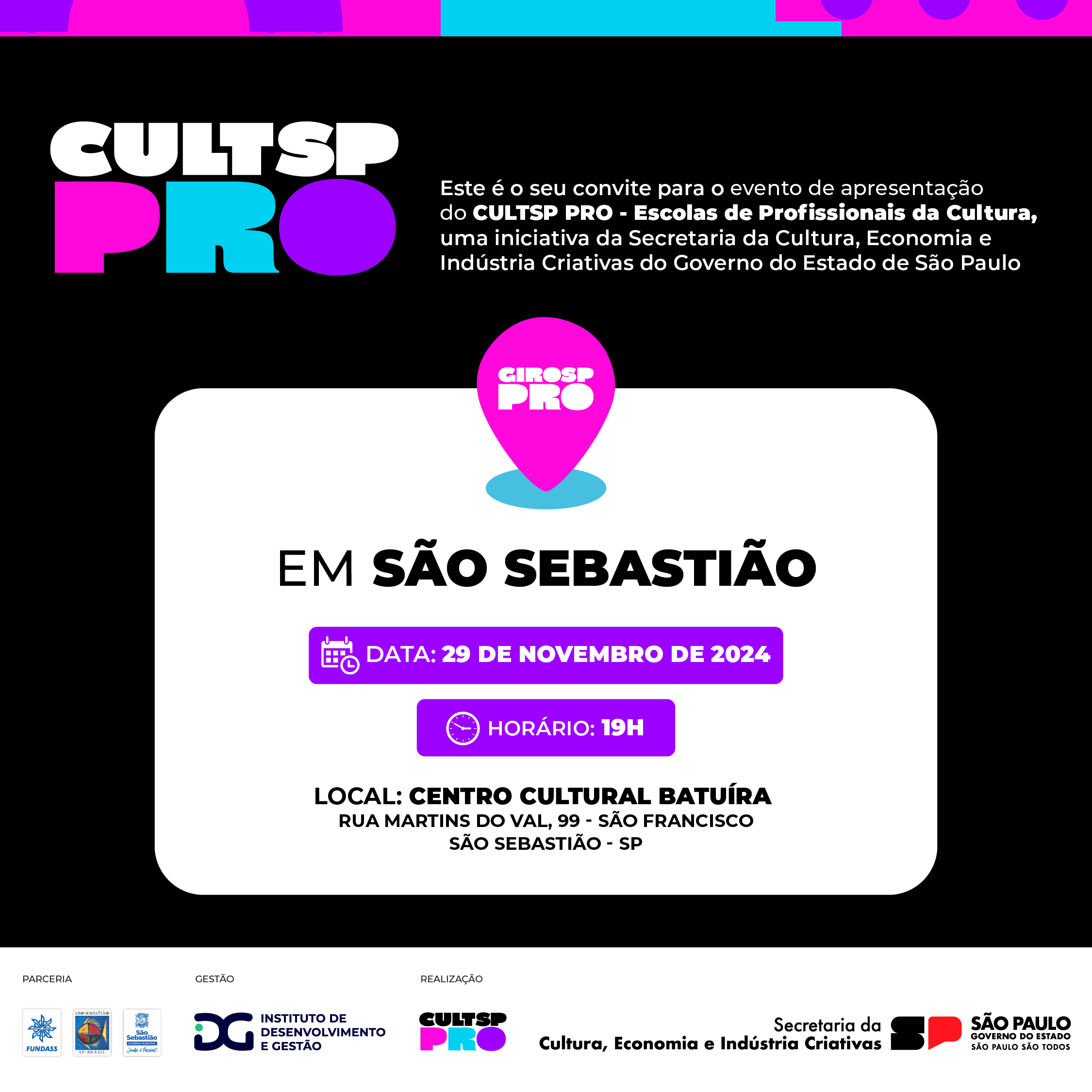 Na próxima sexta-feira (29), às 19h, ocorrerá, no Centro Cultural Batuíra, o GiroSP Pro, uma iniciativa do CULTSP PRO - Escolas de Profissionais da Cultura, programa da Secretaria da Cultura, Economia e Indústria Criativas do Estado de São Paulo, voltado à qualificação de profissionais e ao incentivo à inovação no setor cultural e criativo da região.