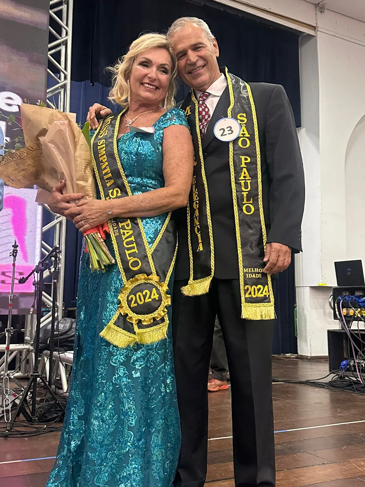Eles foram os vencedores da etapa municipal realizada em junho na Rua da Praia. Em São Paulo, conquistaram também ótimas colocações. Maria Madalena ficou em terceiro lugar, como Miss Simpatia e Waldir em segundo no quesito Mister Elegância.