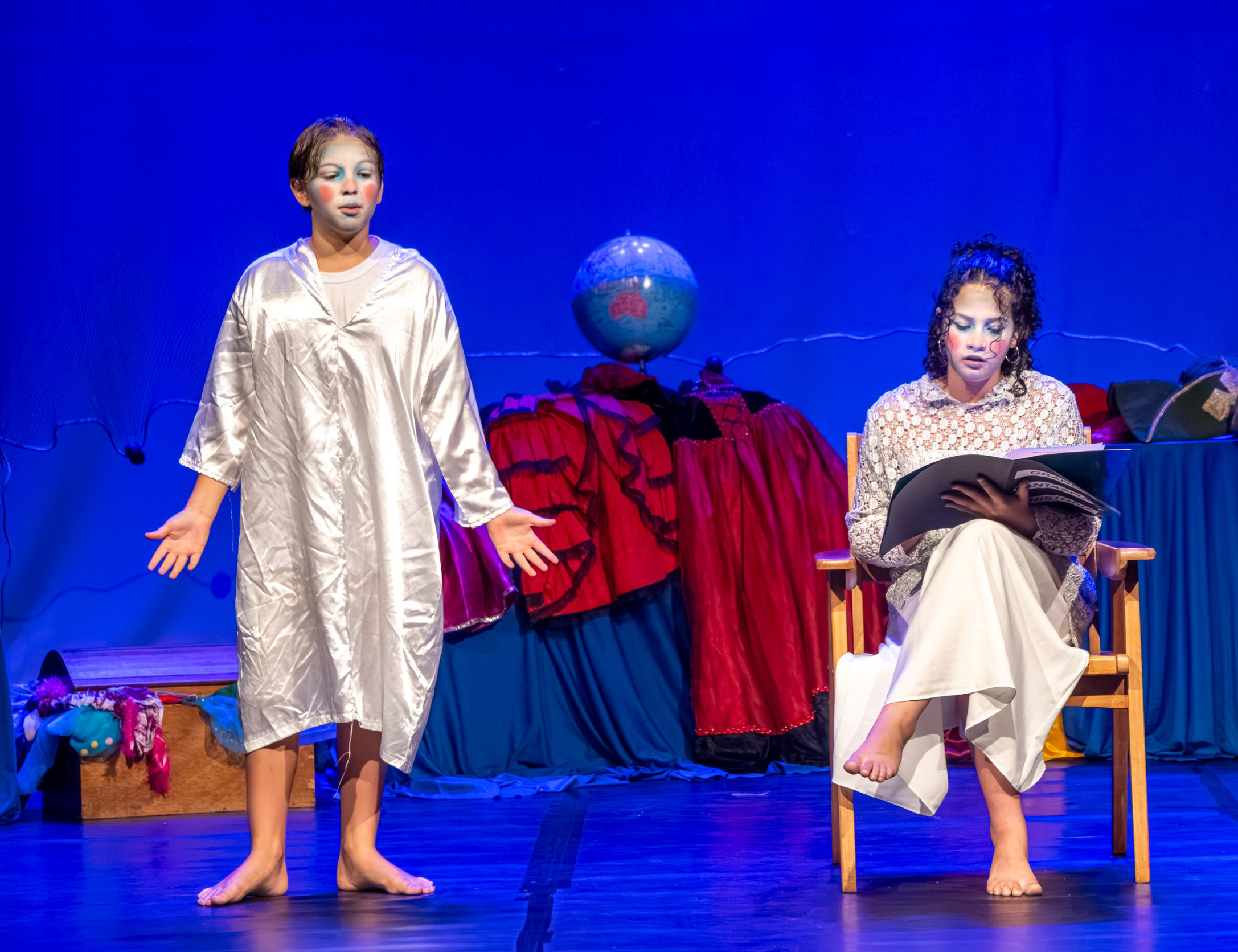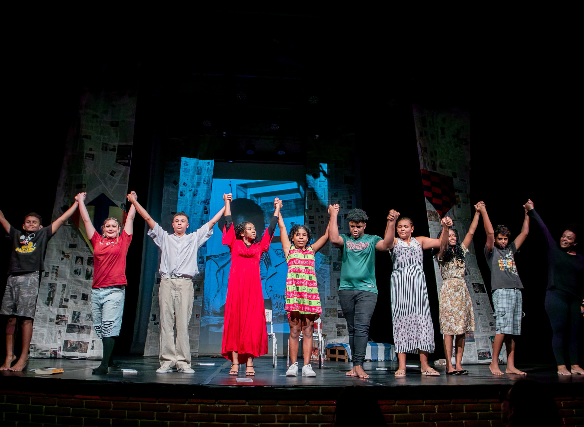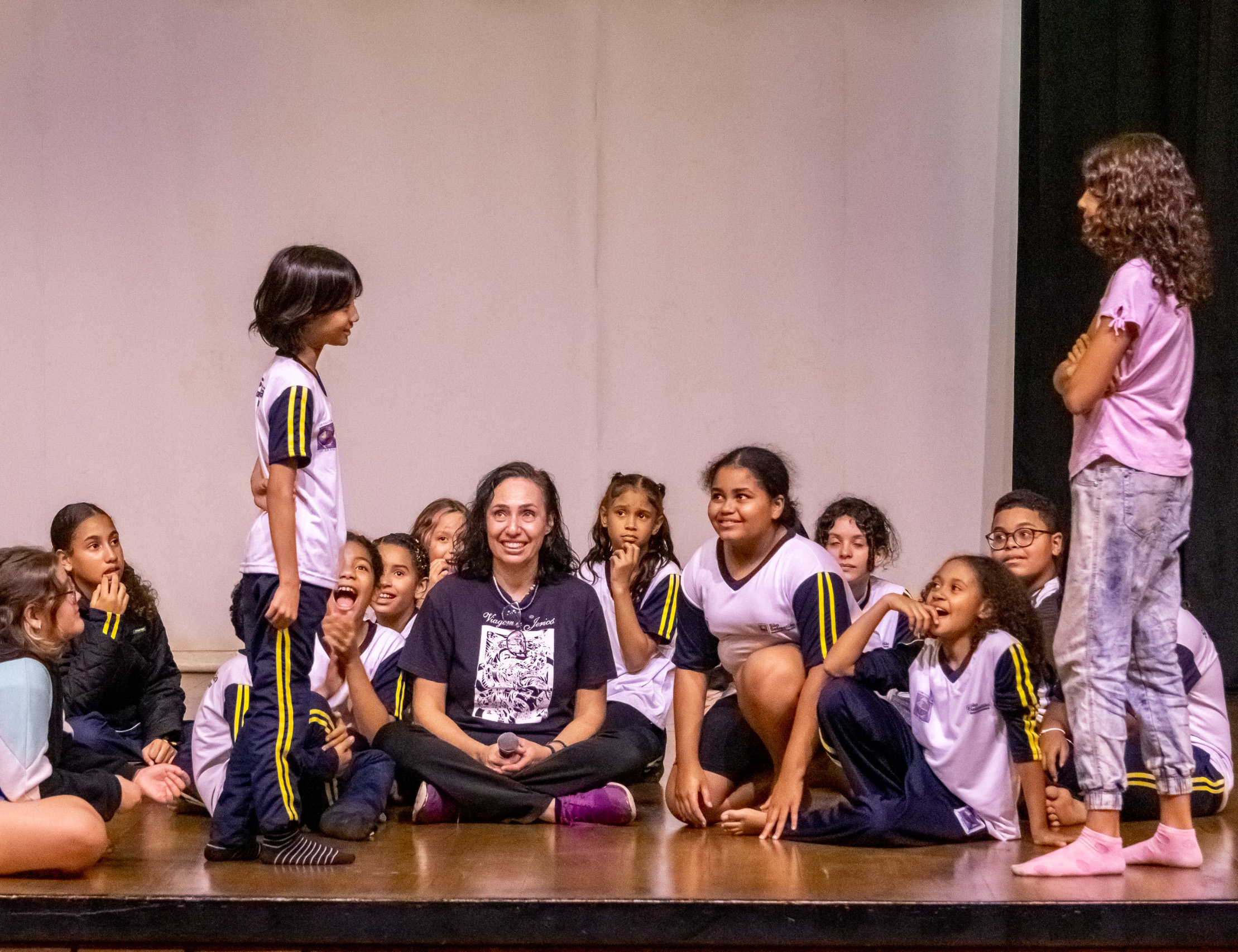 #PraTodosVerem: As fotos mostram atividades de teatro e performance. A primeira foto mostra um grupo de cerca de doze jovens de diversas etnias e ambos os sexos no palco, descalços, de mãos dadas e braços erguidos em agradecimento após uma apresentação, com um cenário feito de jornais. A segunda foto é um plano mais fechado onde um grupo de crianças e adolescentes está sentado ou agachado em uma coxia ou palco, interagindo com uma professora que está sorrindo sentada no centro. A terceira foto é um plano aberto mostrando um grupo maior de jovens e alguns adultos sentados em círculo no chão de madeira de um palco de teatro, descalços, em um momento de roda de conversa ou ensaio. A quarta foto mostra dois jovens artistas no palco em figurino e maquiagem artística em um cenário azul, representando uma cena: um jovem está em pé vestindo uma túnica branca, e o outro está sentado em uma cadeira lendo um livro. Fim da descrição.