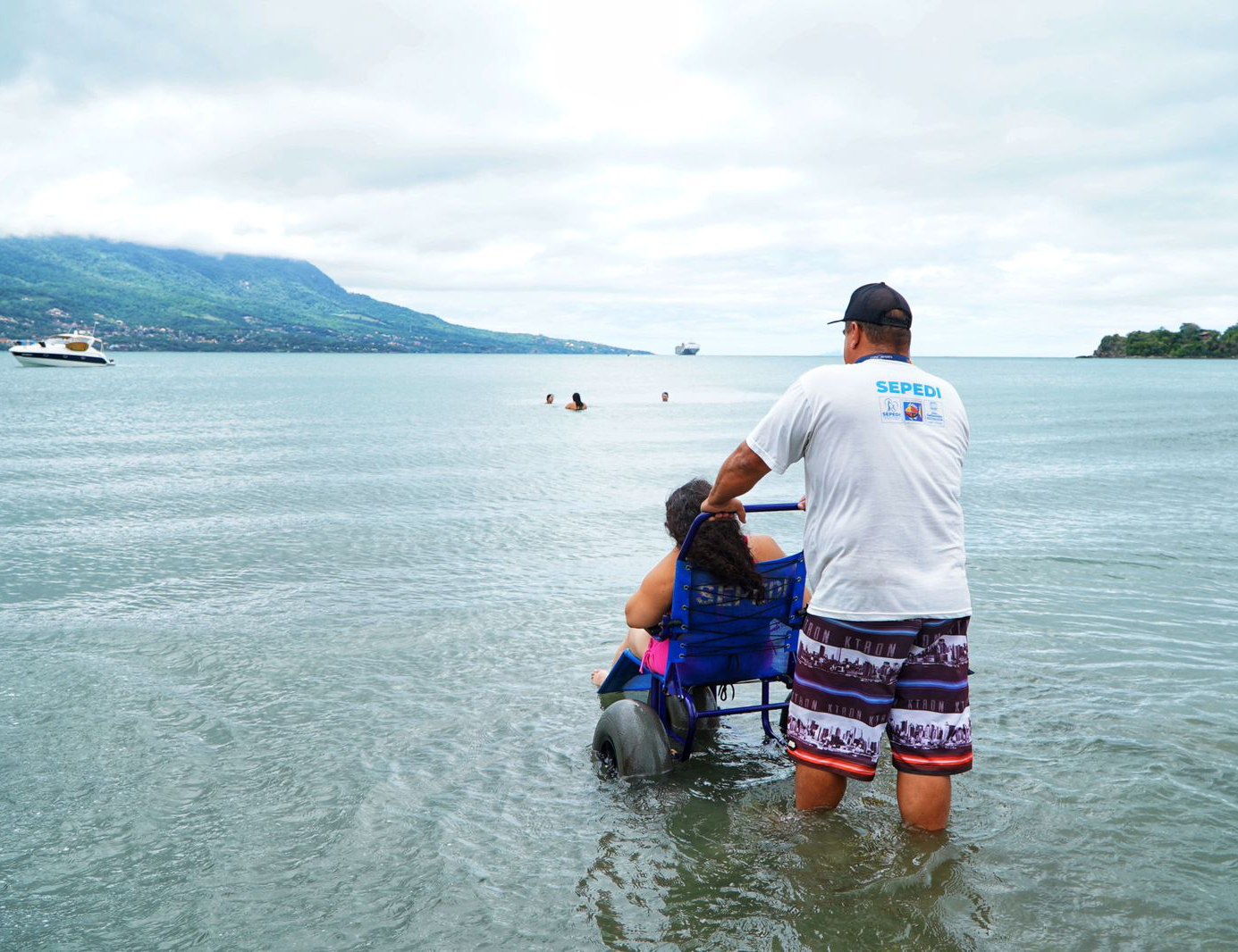 #PraTodosVerem: Sequência de fotos mostra o uso de cadeiras de rodas anfíbias em uma praia com montanhas ao fundo. Nas imagens, um homem de camiseta branca e boné conduz as cadeiras, que possuem rodas grandes e azuis, facilitando o deslocamento na areia e na água. Em uma das fotos, uma mulher de biquíni rosa é levada ao mar com o auxílio de um guarda-vidas; em outra, um homem sentado na cadeira sorri e faz um sinal de "joinha" na beira d'água. Fim da descrição.