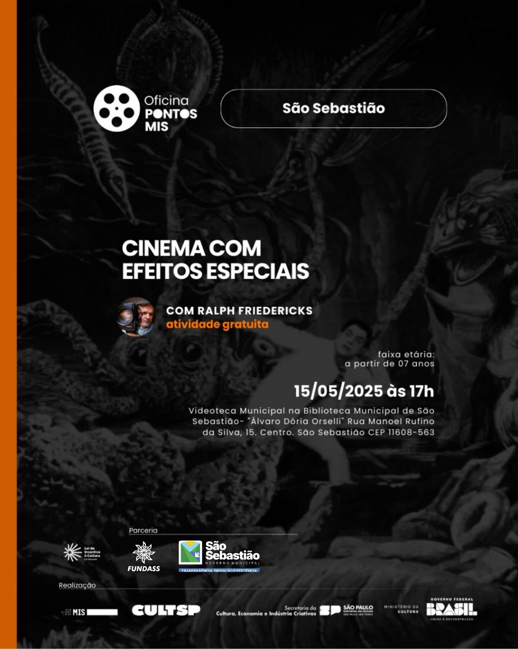 A Prefeitura de São Sebastião, por meio da Fundação Educacional e Cultural ‘Deodato Sant’Anna’ (Fundass), em parceria com a Secretaria de Cultura e Economia Criativa do Governo do Estado de São Paulo e o Pontos MIS, oferece, gratuitamente, no dia 15 de maio (quinta-feira), a Oficina de Cinema com Efeitos Especiais, ministrada pelo cineasta e fotógrafo Ralph Friedericks.