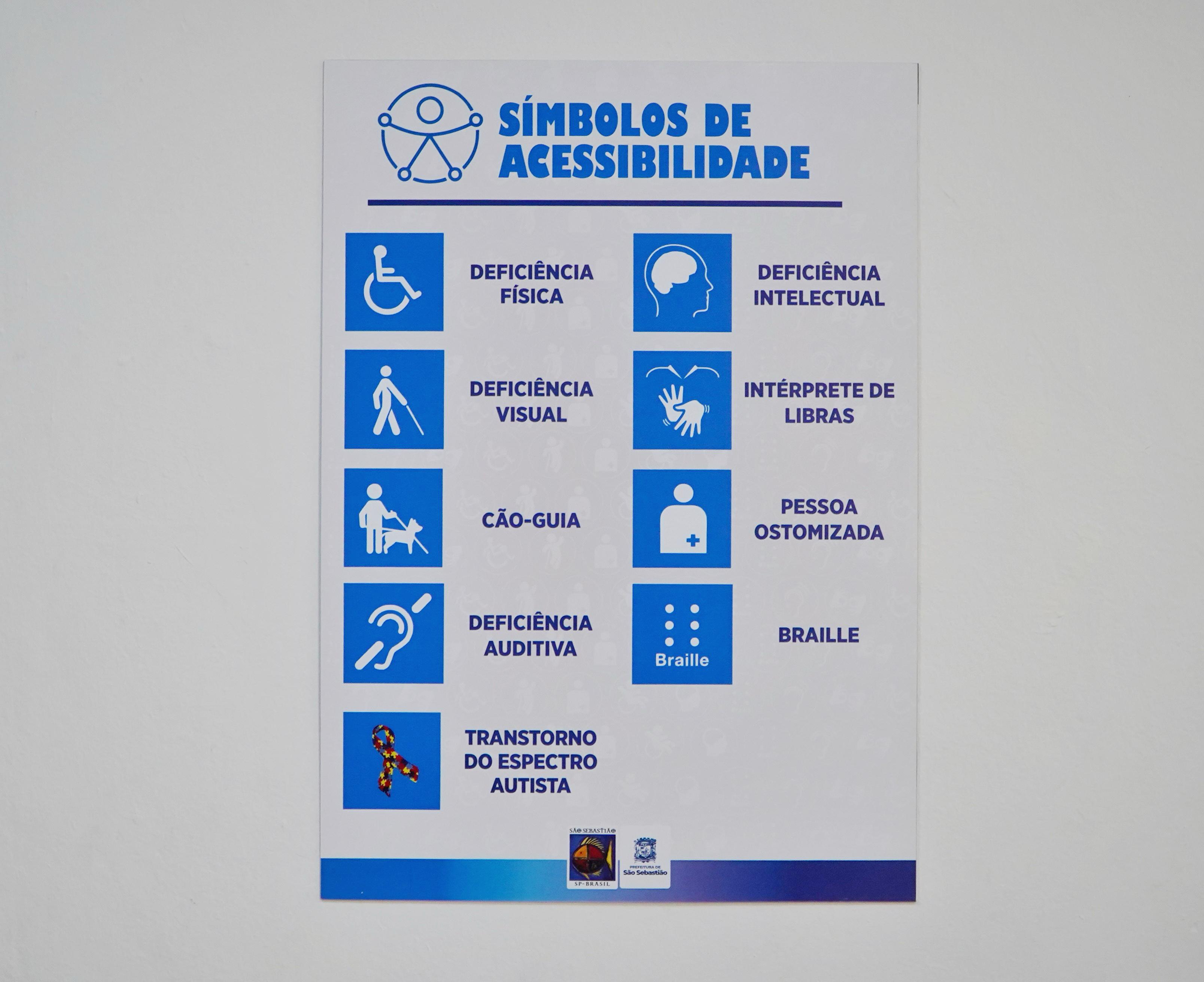Os Símbolos de Acessibilidade retratam as deficiências física, visual, auditiva e intelectual. Também apontam uso de cão-guia, símbolo da pessoa dentro do Transtorno do Espectro do Autista (TEA), quando há Intérprete de Libra, Pessoa Ostomizada e Braille.