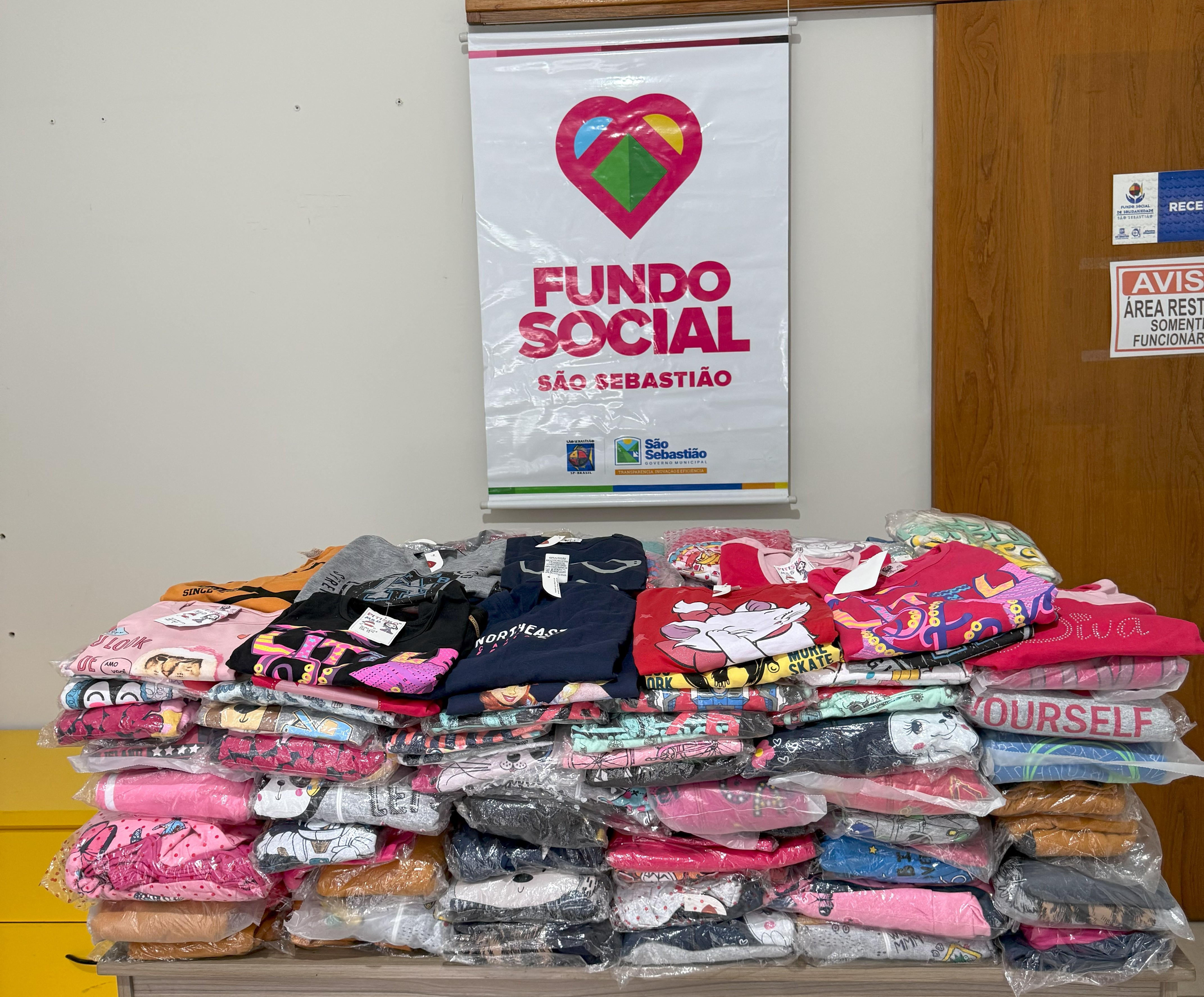 #PraTodosVerem: Em ambiente interno, sobre uma mesa, há várias pilhas de roupas dobradas, sendo a maioria peças infantis e coloridas, com estampas variadas, incluindo personagens e frases. As roupas estão organizadas em sacos plásticos transparentes. Ao fundo, pendurado na parede, há um banner com o logotipo em forma de coração colorido e os dizeres “Fundo Social São Sebastião”, acompanhado do brasão da cidade e da logomarca da Prefeitura de São Sebastião. À direita, há uma porta de madeira com avisos colados, um deles indicando que a área é restrita a funcionários. Fim da descrição.