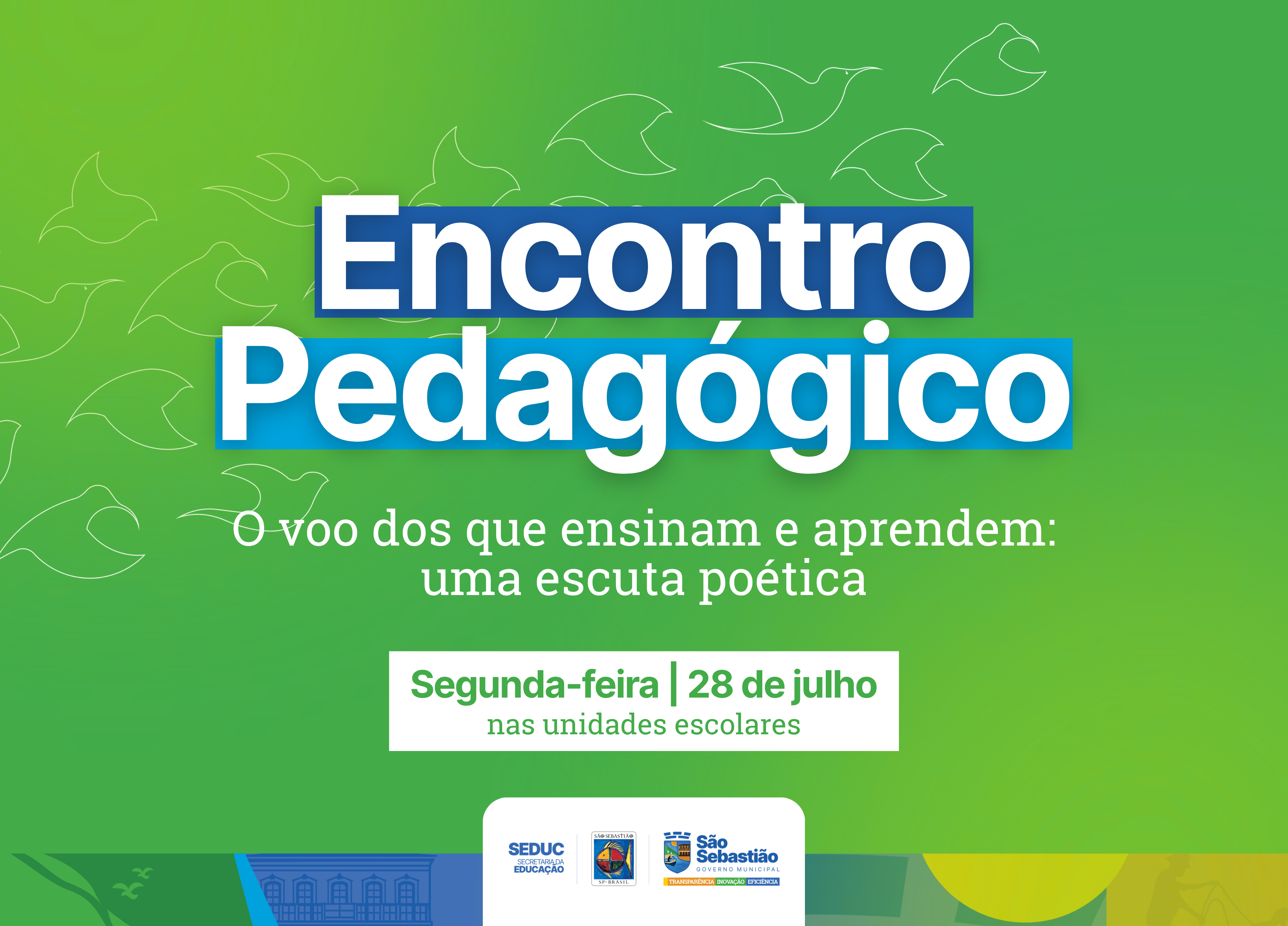 #PraTodosVerem: arte gráfica com fundo verde, decorado com silhuetas de pássaros em voo, em tons suaves. Ao centro, está escrito “Encontro Pedagógico” em letras grandes e brancas com sombra azul. Abaixo, em branco, o tema do encontro: “O voo dos que ensinam e aprendem: uma escuta poética”. Em destaque, um retângulo branco informa: “Segunda-feira | 28 de julho”, seguido da frase “nas unidades escolares”. Na parte inferior, aparecem os logos da Secretaria da Educação, do Governo Municipal de São Sebastião e o brasão da cidade. Em seguida, fotos ilustrativas de professores em diferentes escolas sentados em carteiras e mesa de reunião observando a secretária da Educação Marta Braz falando. Fim da descrição.