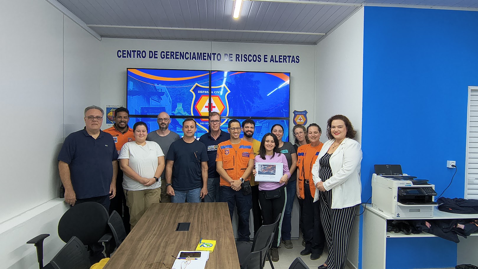 #PraTodosVerem: As imagens mostram momentos da reunião e das atividades de campo entre a equipe da Defesa Civil de São Sebastião e representantes da Universidade de São Paulo (USP). Na primeira foto, os participantes estão reunidos ao redor de uma mesa, no Centro de Gerenciamento de Riscos e Alertas, discutindo estratégias. Na segunda imagem, o grupo posa para uma foto institucional sorridente, à frente de telas com o brasão da Defesa Civil. Na terceira, a equipe está na praia de Cambury, de frente para uma área de mata, avaliando o local. Já na última imagem, dois profissionais da USP interagem ao lado de um drone posicionado no chão, em área gramada, demonstrando o uso da tecnologia em ações preventivas. Fim da descrição.