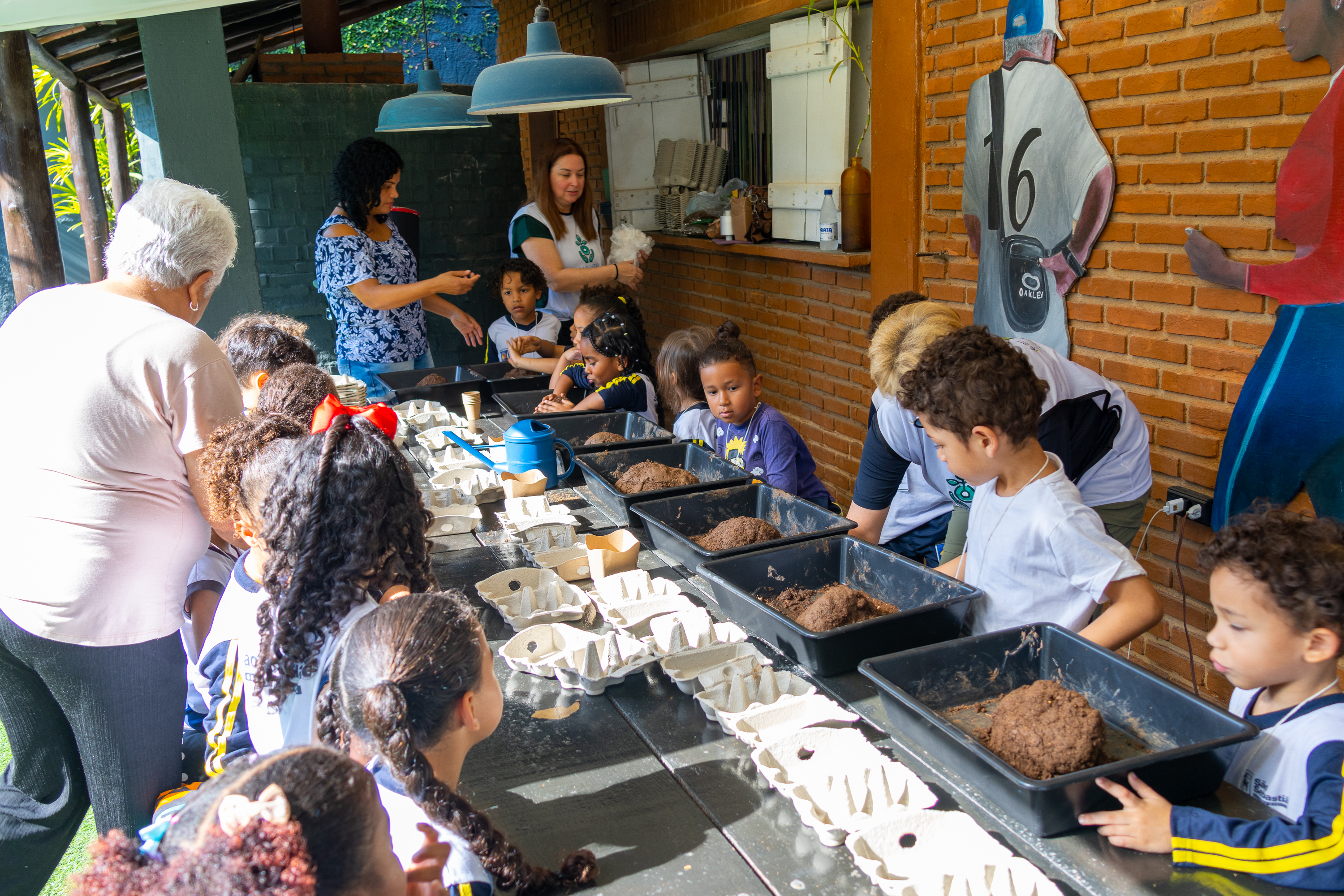 Durante a atividade, as crianças participaram de uma contação de histórias, confeccionaram bolas de sementes de girassol e decoraram caixinhas de ovos, levando para casa seus próprios “jardins” com sementes para serem plantadas. Essas ações estimulam a criatividade, o cuidado com a natureza e a consciência ambiental desde a primeira infância.
