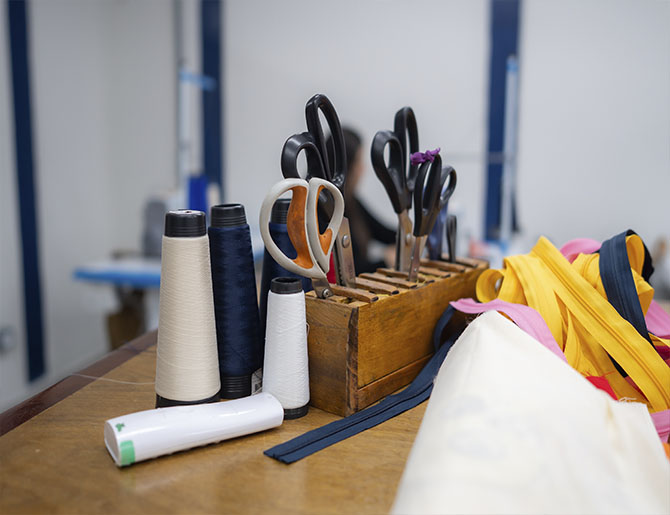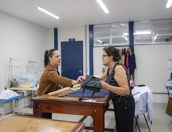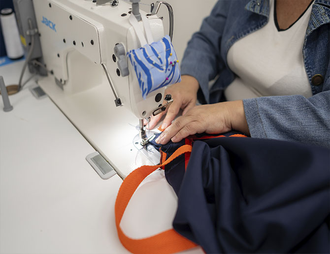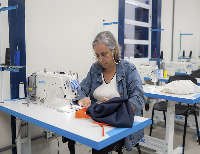 #PraTodosVerem: As imagens mostram um ambiente de oficina de costura. Em uma das fotos, uma mulher costura em uma máquina industrial, trabalhando em um tecido azul-marinho com alças laranja. Em outra, a mesma mulher aparece concentrada na máquina, vestindo óculos e jaqueta jeans. Há também um registro de materiais utilizados na confecção, como linhas de diferentes cores, tesouras e zíperes coloridos organizados sobre uma mesa. Em outra cena, duas mulheres conversam e analisam peças de tecido e bolsas em uma grande mesa de trabalho. O espaço é iluminado, organizado e equipado com várias máquinas de costura.