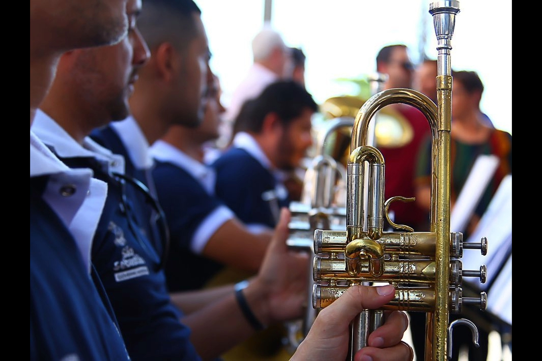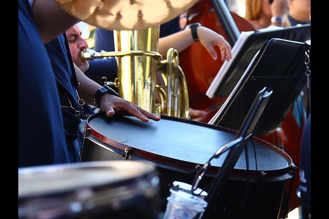#PraTodosVerem: imagens que mostram músicos da Banda Municipal de São Sebastião tocando instrumentos de sopro e percussão durante uma apresentação ao ar livre. Fim da descrição.