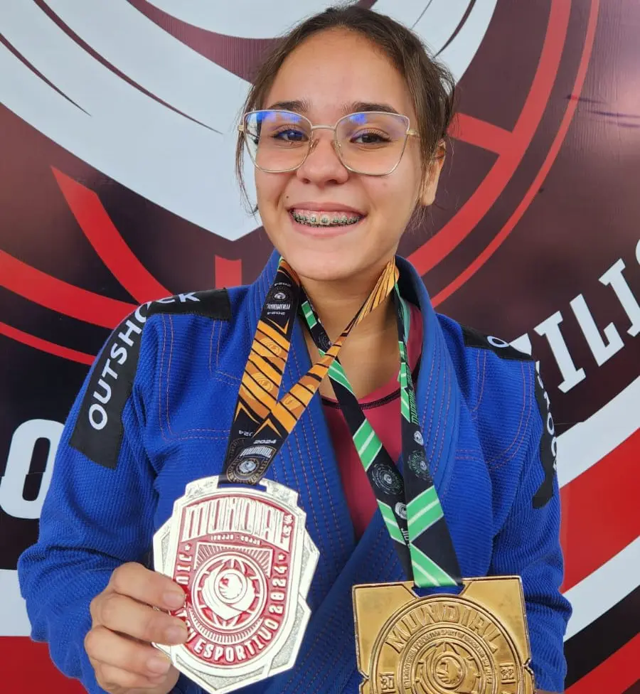 #PraTodosVerem: imagens da atleta do projeto social Evolution BJJ, Paola Vitoria Tribst, que foi vice-campeã na categoria feminino juvenil do Campeonato Mundial da Confederação Brasileira de Jiu Jitsu Esportivo. Fim da descrição.