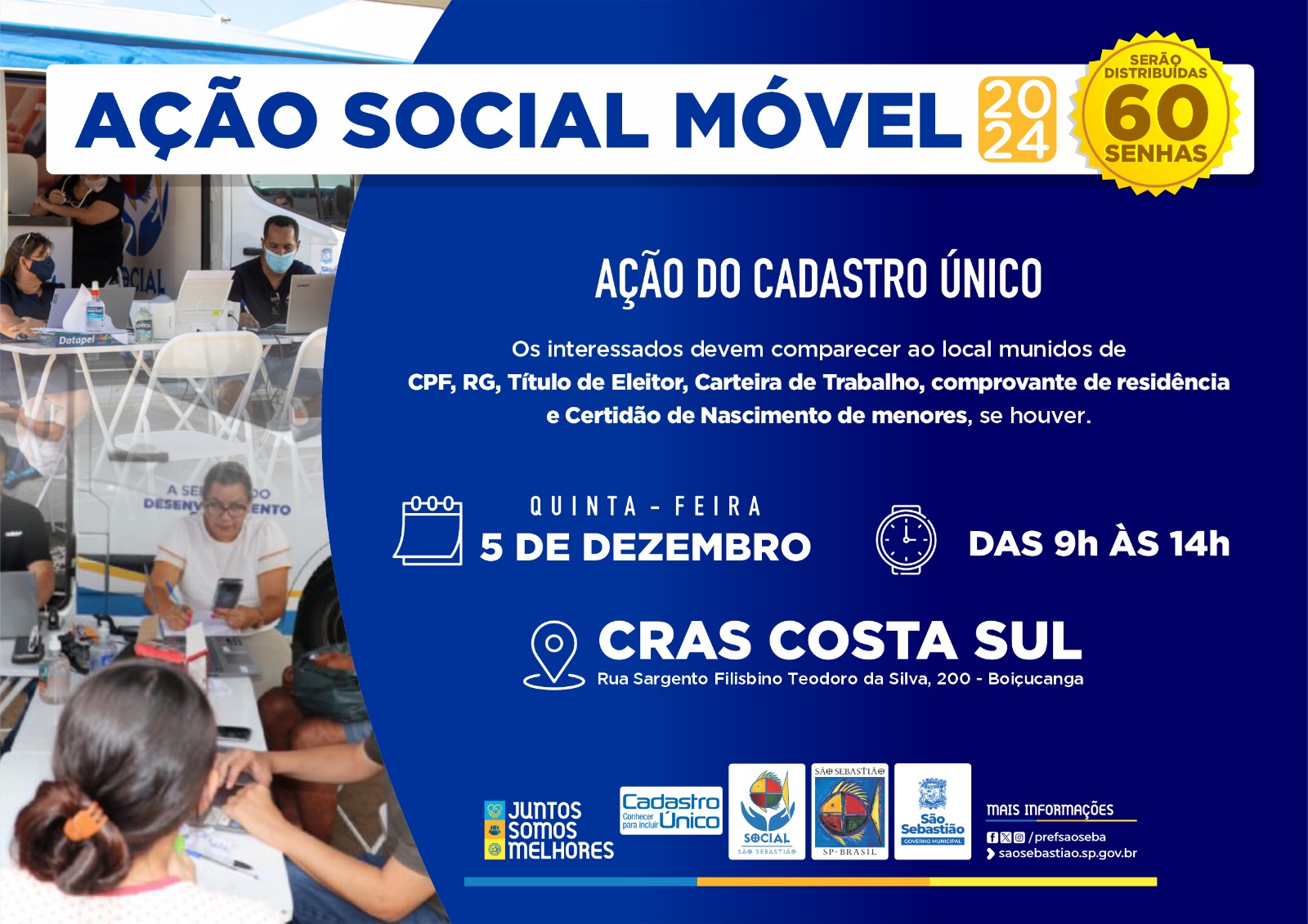 A Prefeitura de São Sebastião, por meio da Secretaria de Desenvolvimento Econômico e Social (SEDES), realiza o projeto ‘Ação Social Móvel’ na quinta-feira (5), das 9h às 14h, em frente ao Centro de Referência de Assistência Social (CRAS) Costa Sul, à Rua Sargento Filisbino Teodoro da Silva, 200, no bairro Boiçucanga.