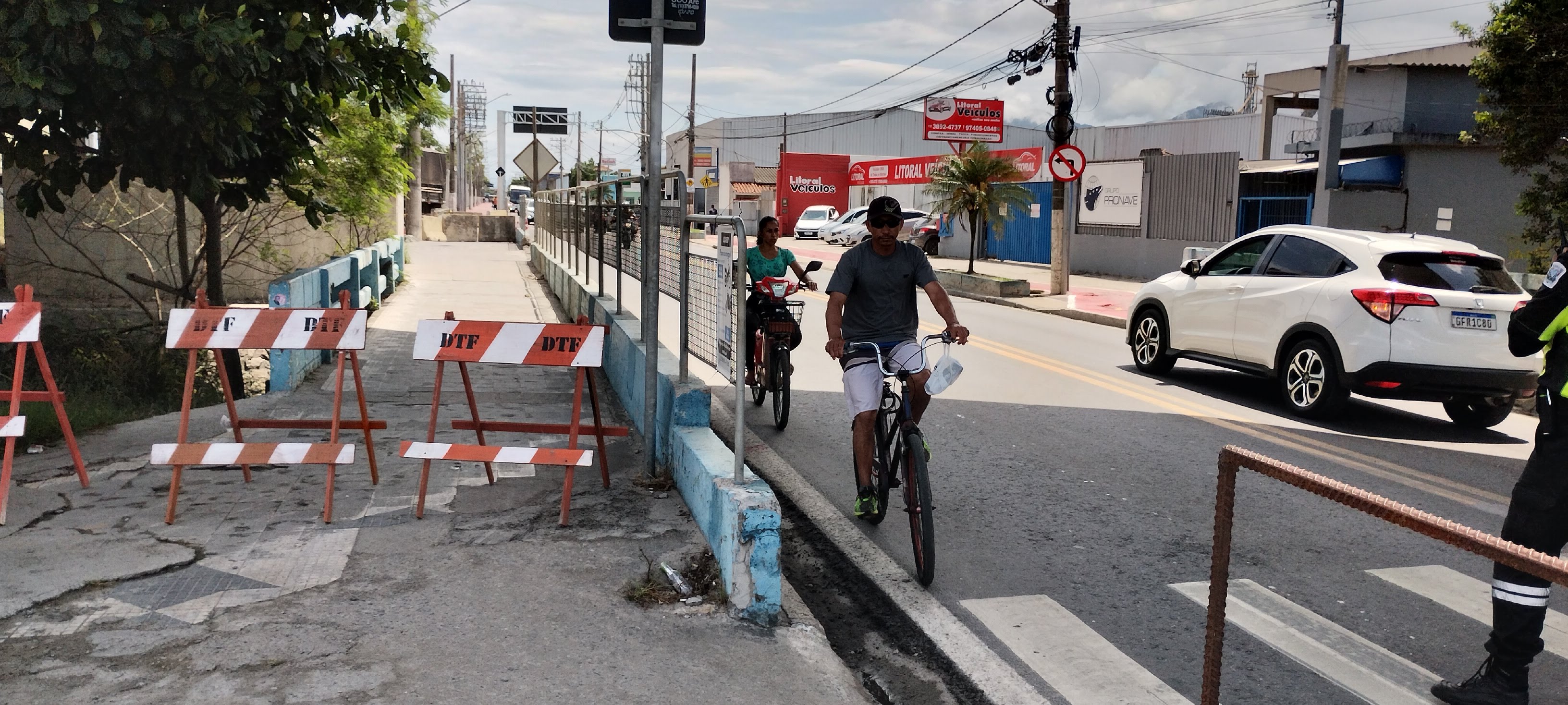 #PraTodosVerem: sequência de imagens de pedestres, ciclistas e veículos em mesmo espaço na avenida quer vai para a Topolândia, tendo o acesso à ciclovia bloqueado. Fim da descrição.