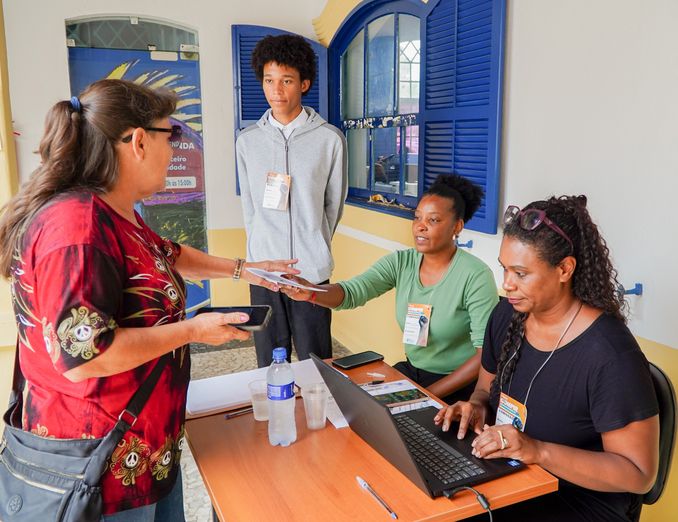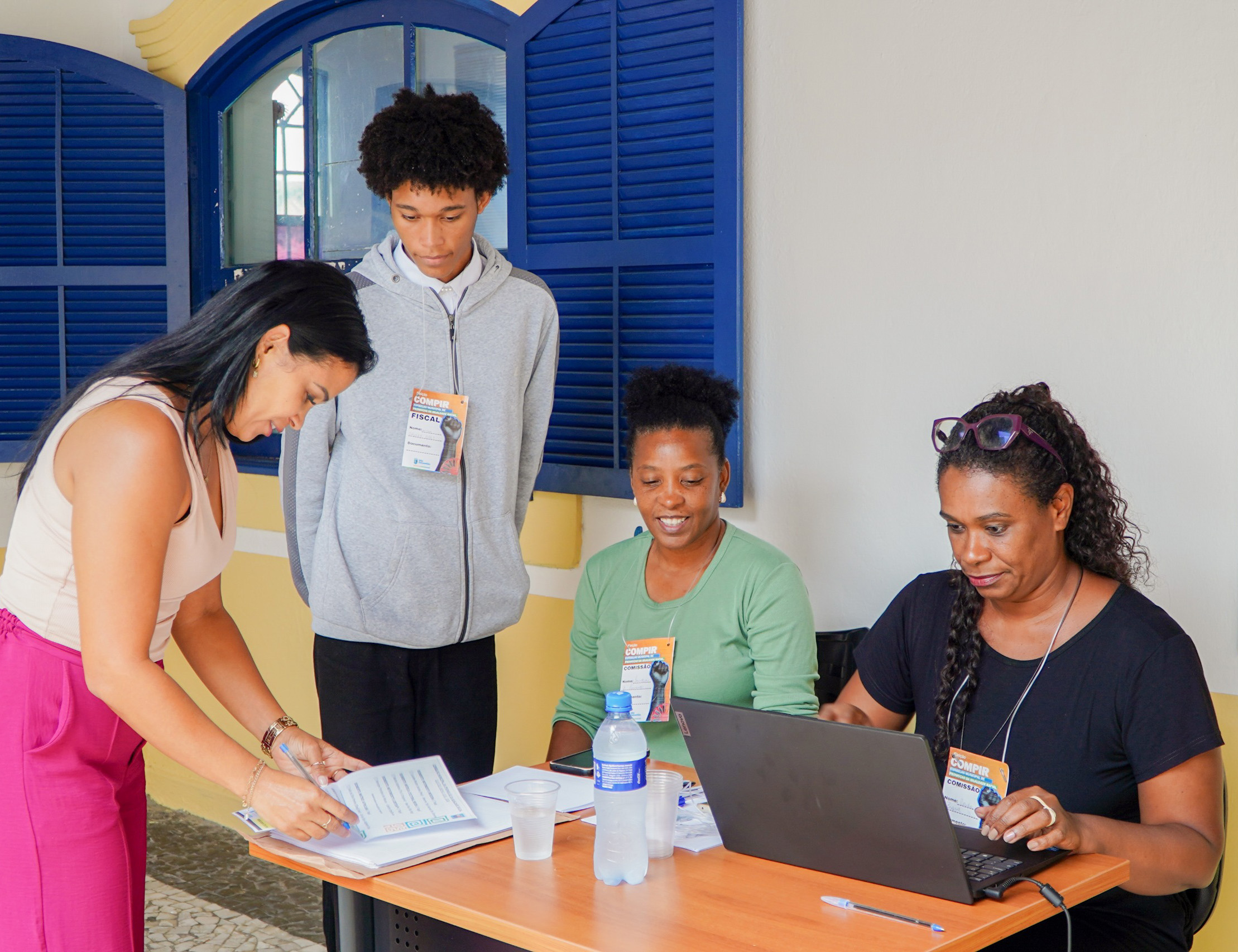 #PraTodosVerem Conjunto de quatro fotos mostrando o atendimento ao público durante atividade de cadastramento comunitário. Em um espaço interno, com paredes claras e janelas azuis, mulheres negras adultas, identificadas com crachás, estão sentadas atrás de uma mesa realizando atendimentos com apoio de um notebook, formulários, canetas e garrafas de água. Em algumas imagens, uma jovem negra e um jovem negro, ambos usando crachá, acompanham e auxiliam o atendimento. Moradoras se aproximam da mesa para entregar documentos, conversar e receber orientações. Em outra foto, três integrantes da equipe posam sorrindo para a câmera atrás da mesa de trabalho. Ao fundo, há cadeiras, cartazes informativos e outras pessoas aguardando ou preenchendo formulários, reforçando o clima de organização, acolhimento e participação comunitária.