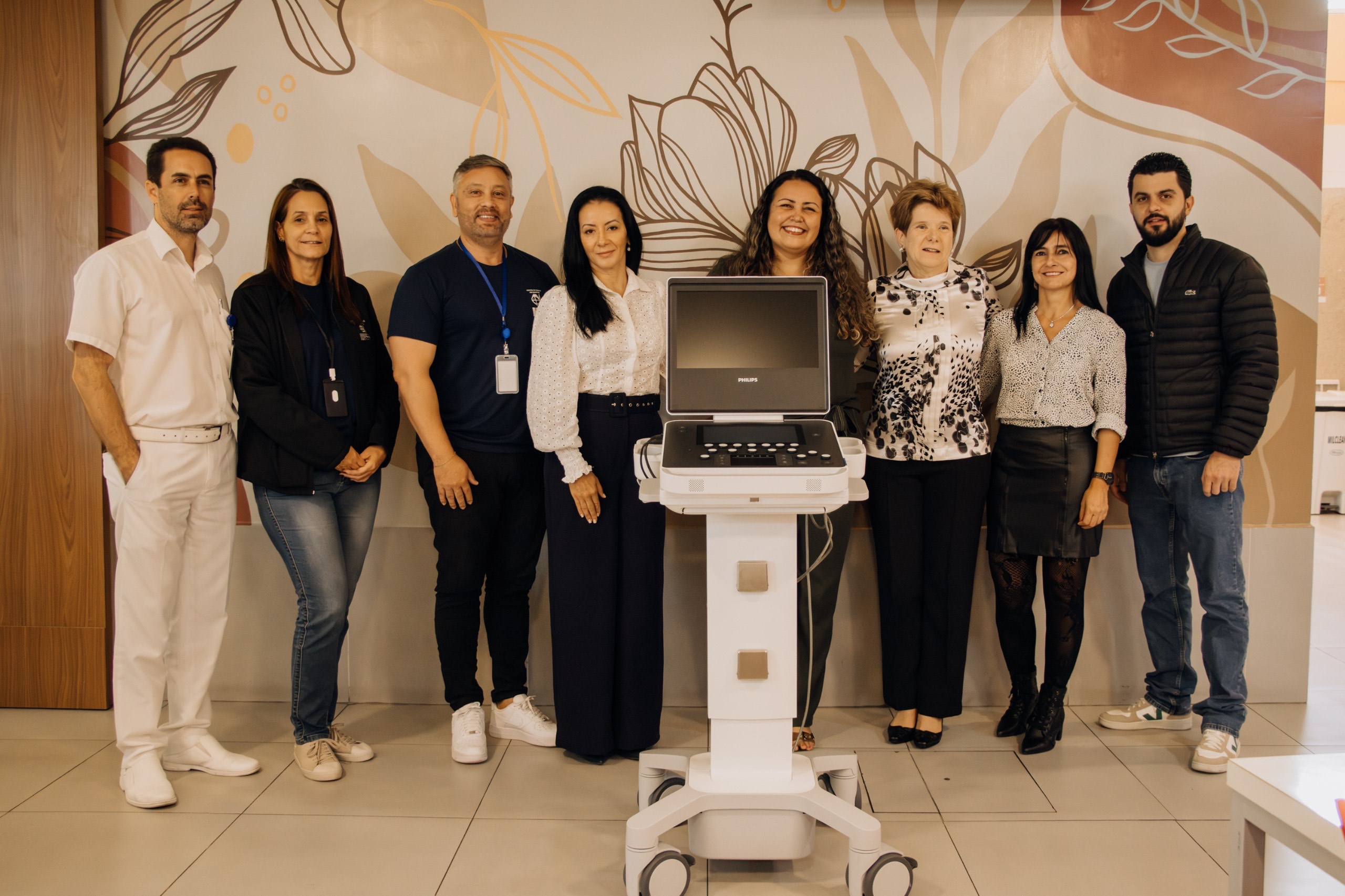 #PraTodosVerem: em uma sequência de fotos, profissionais da saúde e representantes estão reunidos para registrar a entrega de um novo aparelho de ultrassom da marca Philips. As imagens mostram o equipamento em destaque, com sua tela e painel de controle, e também os sorrisos de alegria da equipe que celebra a chegada do aparelho, que será utilizado na maternidade do hospital. O fundo é decorado com um mural em tons suaves e flores estilizadas. A última imagem mostra a equipe reunida em frente à entrada da ala da Maternidade, identificada por uma placa rosa com letras brancas. Fim da descrição.