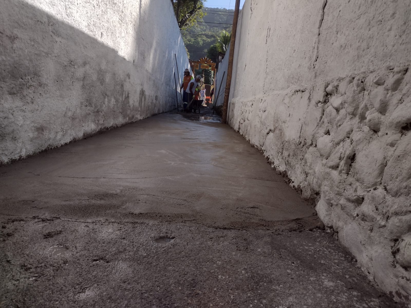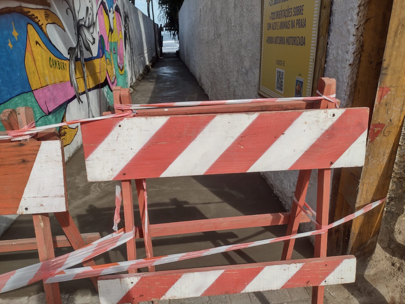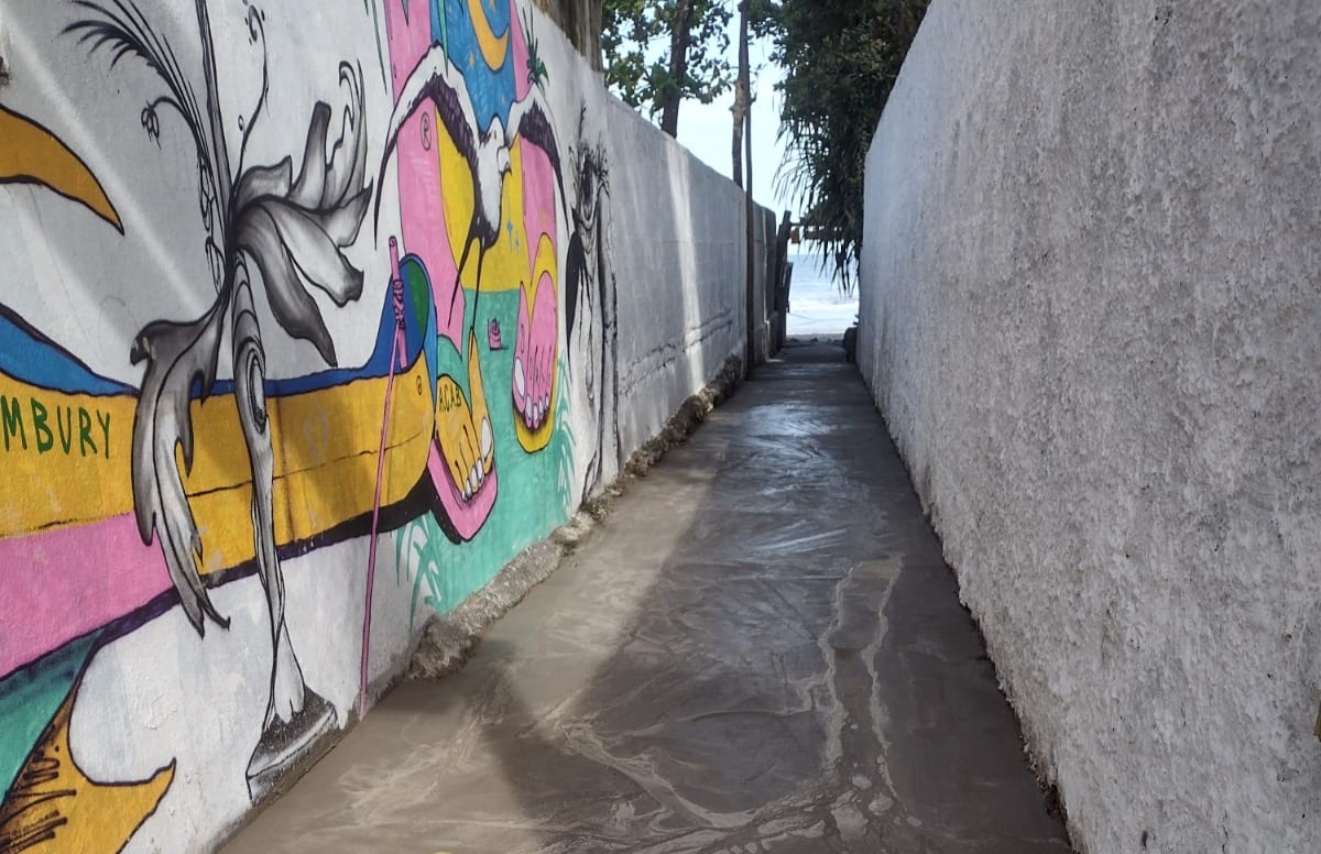 #PraTodosVerem: imagens mostram a entrada da Praia de Cambury passando por melhorias. A sequência apresenta um corredor estreito entre dois muros brancos. No lado esquerdo, há um mural colorido com desenhos de plantas e pés descalços sobre pranchas. O piso do corredor aparece recém-cimentado. Em frente à entrada, há cavaletes laranja e brancos com faixas de sinalização impedindo a passagem. Em outra imagem, dois trabalhadores uniformizados da limpeza urbana aparecem preparando a área com carrinho de mão e ferramentas. O local está isolado com fitas de segurança. O objetivo é melhorar o acesso de pedestres à praia.Fim da descrição.