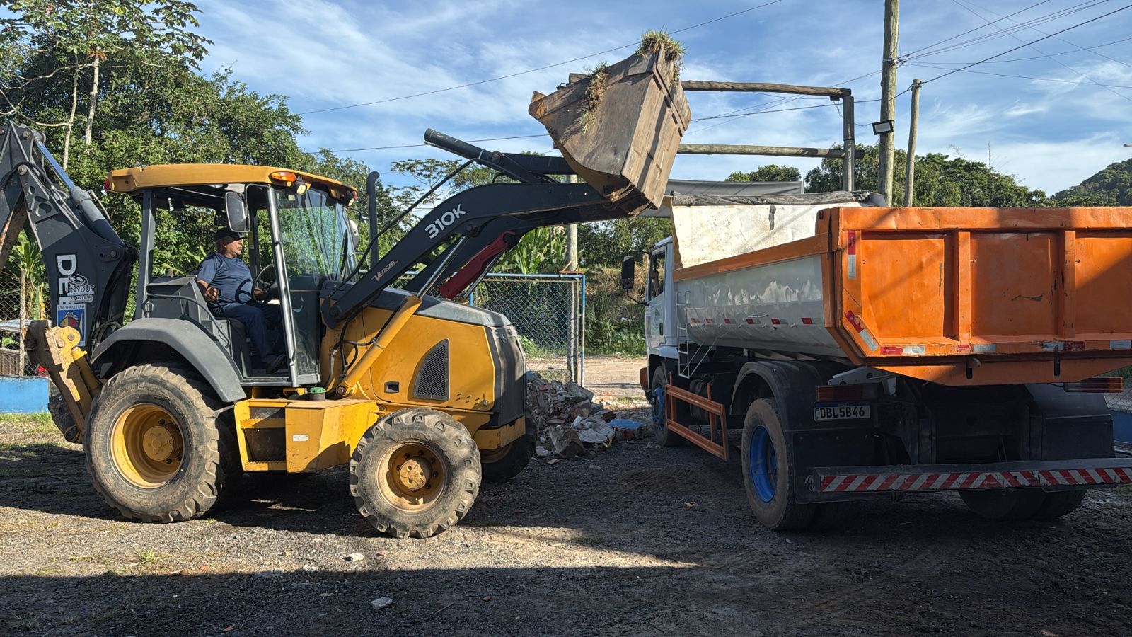 #PraTodosVerem: imagens mostram ações de manutenção e limpeza na comunidade de Cambury. Na primeira, um trator-carregadeira despeja entulhos em um caminhão basculante. Em outras fotos, homens realizam reparos na rede de proteção de uma quadra esportiva, utilizando escada e ferramentas. O céu está azul e o ambiente mostra uma área comunitária sendo cuidada por trabalhadores. Fim da descrição.