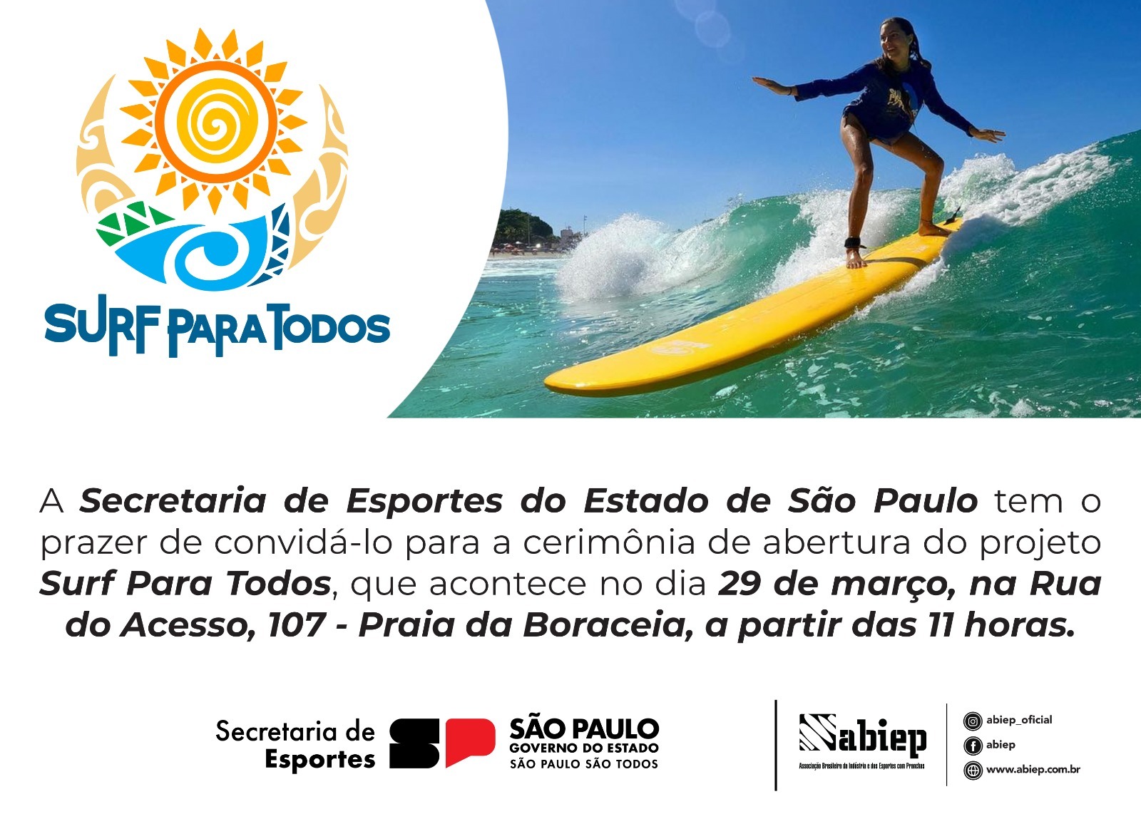 O projeto ‘Surf Para Todos’ chega em São Sebastião, nesta quinta-feira (27/3), a partir das 9h, para aproximar a modalidade daquelas pessoas que nunca subiram ou ainda estão se familiarizando com uma prancha. A iniciativa é patrocinada pela Secretaria de Esportes do Estado de São Paulo e idealizada pela Associação Brasileira da Indústria e dos Esportes com Pranchas (Abiep).