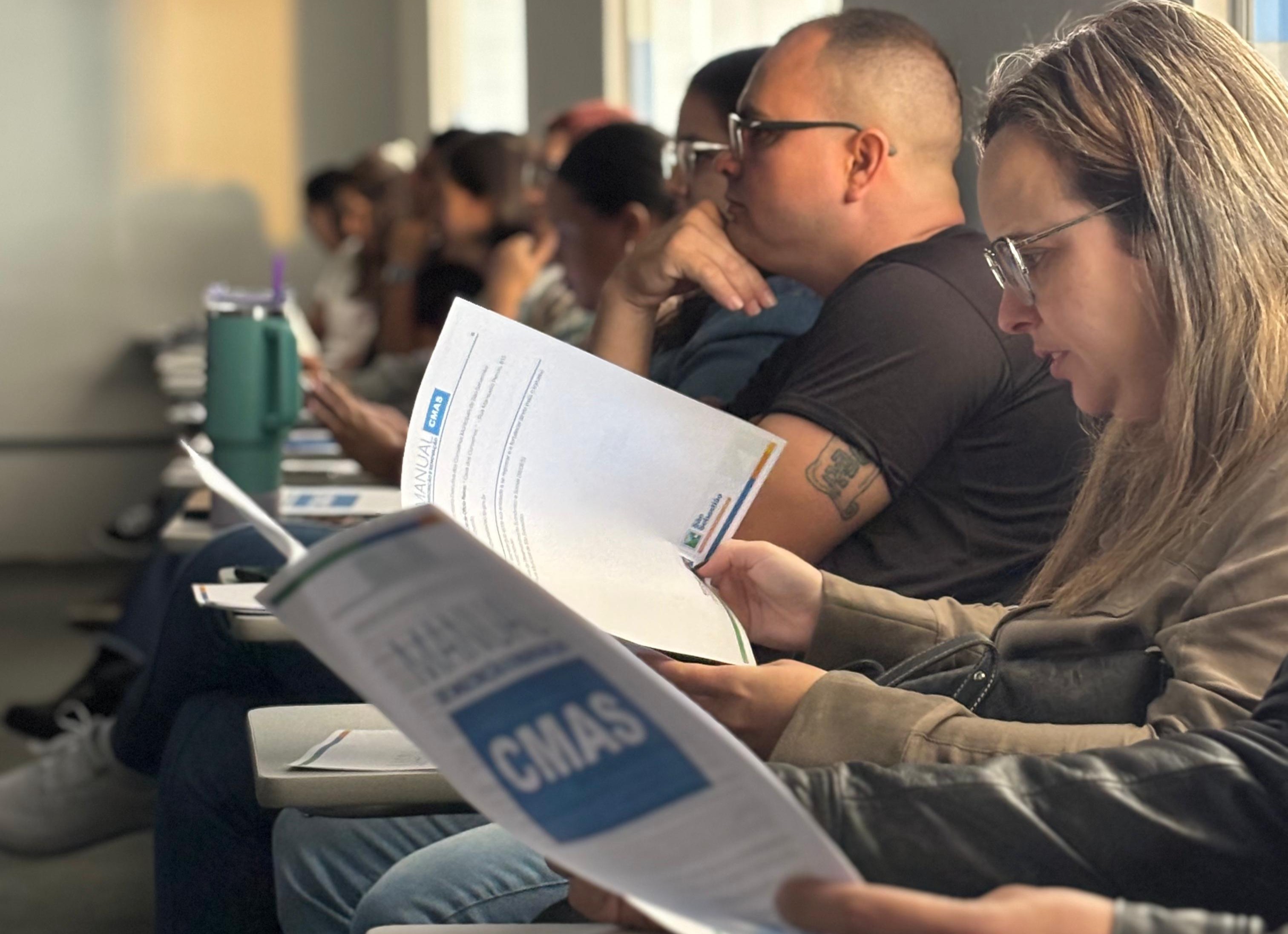 #PraTodosVerem: As imagens mostram momentos de um workshop realizado em uma sala de aula com paredes brancas e cadeiras escolares. Na primeira foto, um homem de camiseta branca fala ao microfone com a mão levantada, enquanto uma mulher ao lado, de blazer preto e blusa branca, o observa. Na segunda imagem, outro homem, usando camiseta preta, fala ao microfone em frente a um telão com a apresentação do CMDCA – Conselho Municipal dos Direitos da Criança e do Adolescente. A terceira imagem mostra pessoas sentadas, concentradas, folheando manuais do CMAS. Em destaque, uma mulher de óculos lê atentamente o conteúdo. A quarta imagem mostra de perto as mãos de uma pessoa segurando o manual de inscrição no CMAS, com o texto explicativo visível e logotipos oficiais no rodapé do material. Fim da descrição.