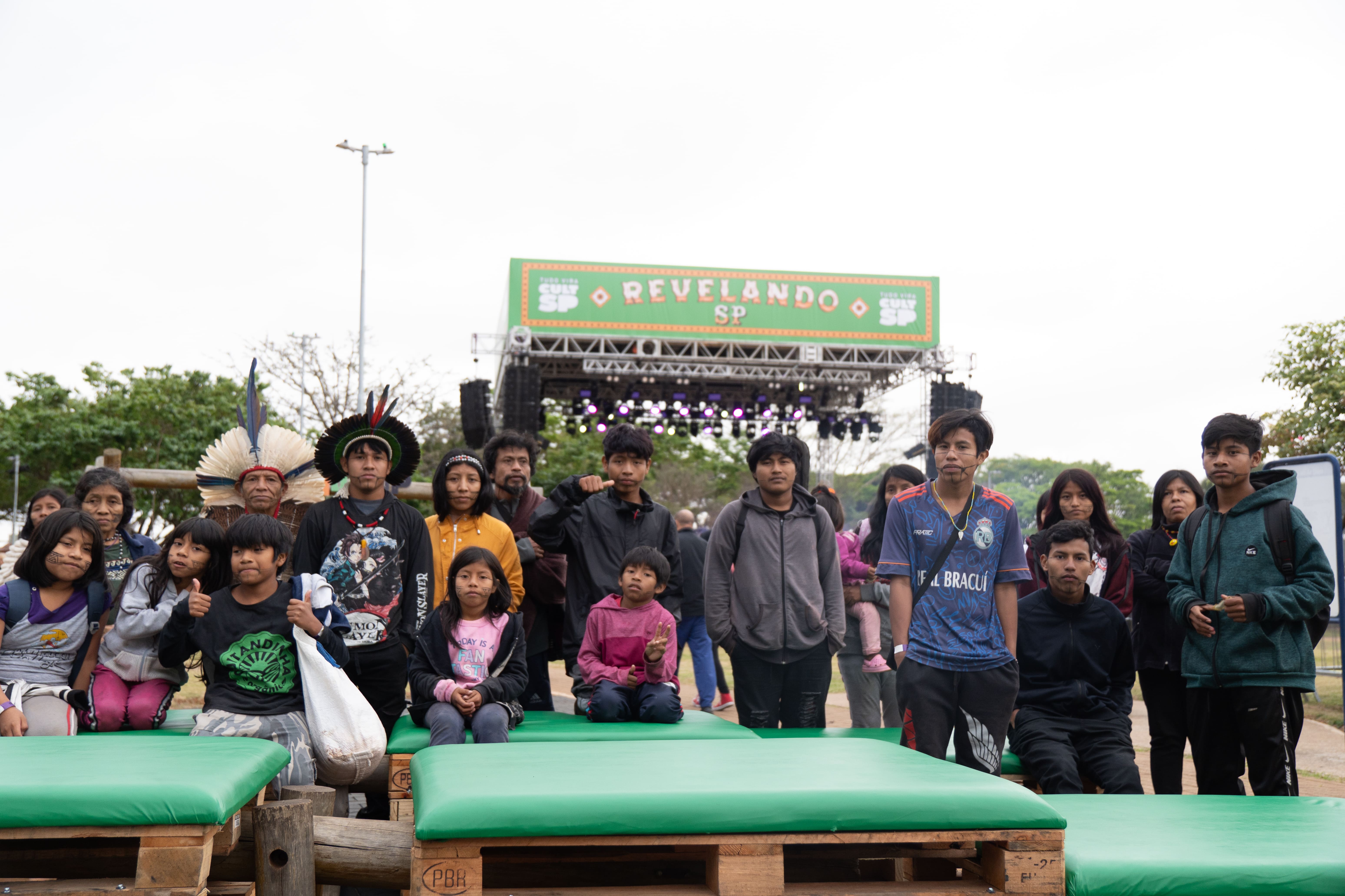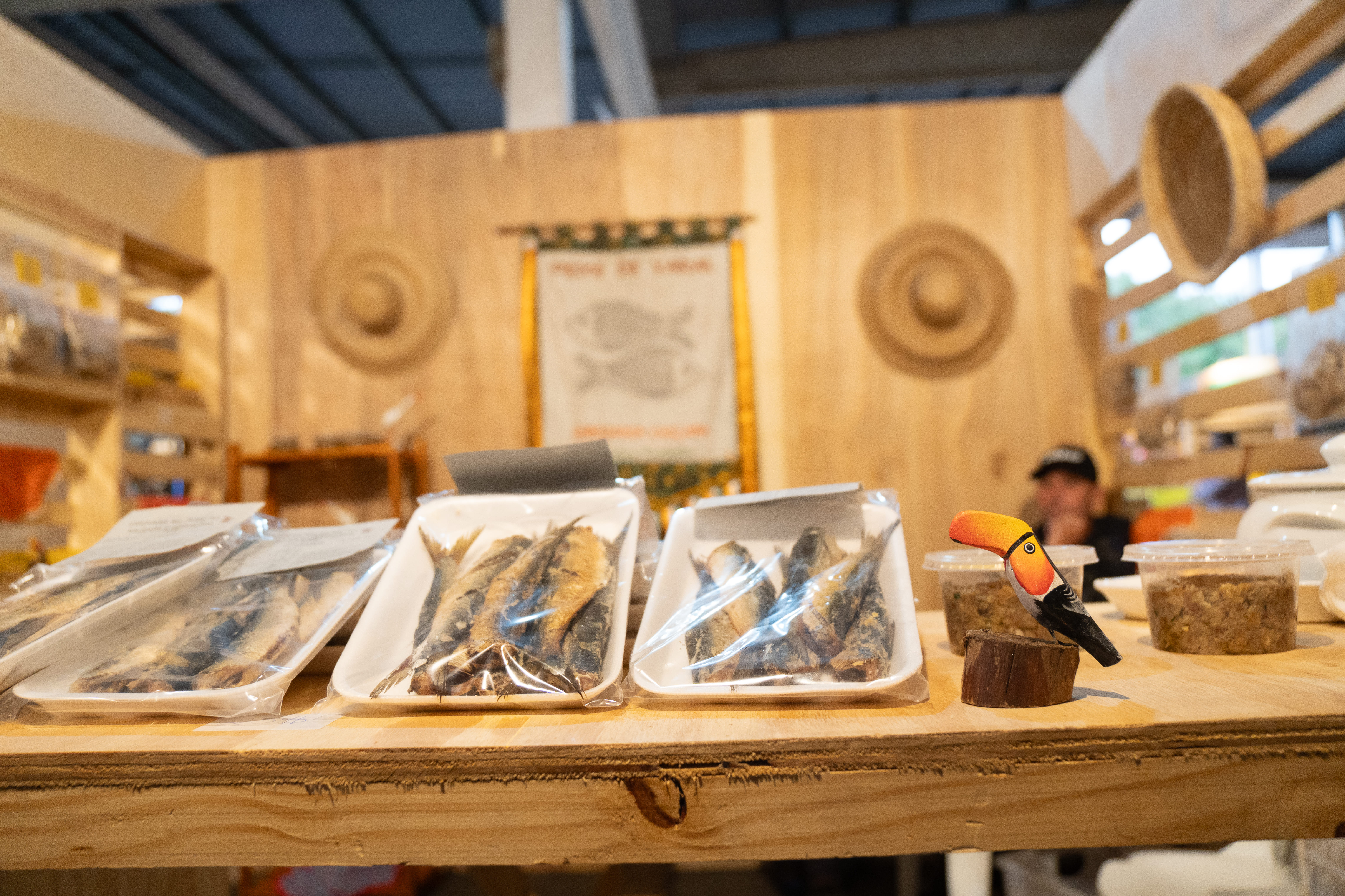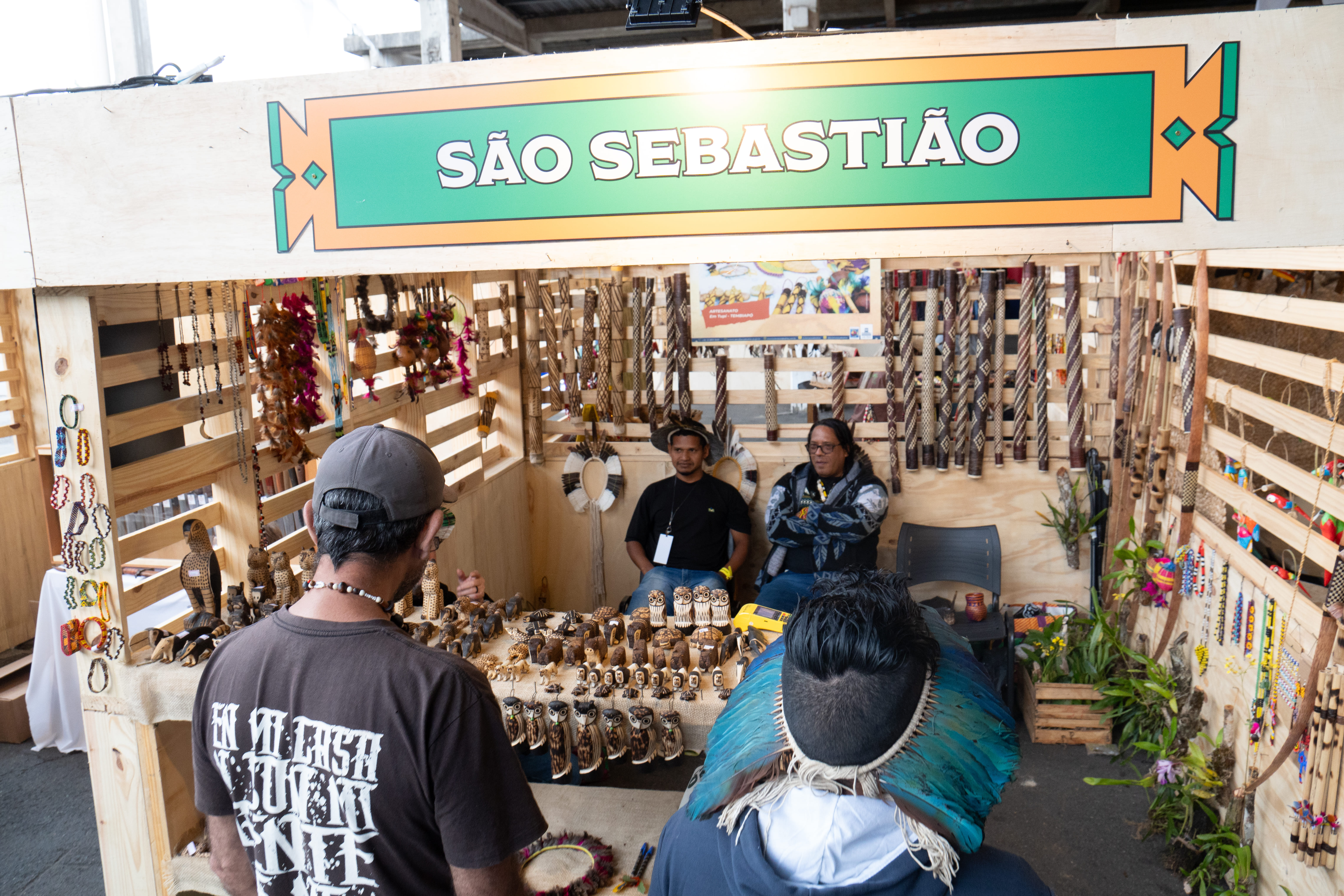 #PraTodosVerem: imagens dos estandes de São Sebastião no Revelando SP, com a presença de indígenas, artesanato caiçara e peixe de varal. Fim da descrição.
