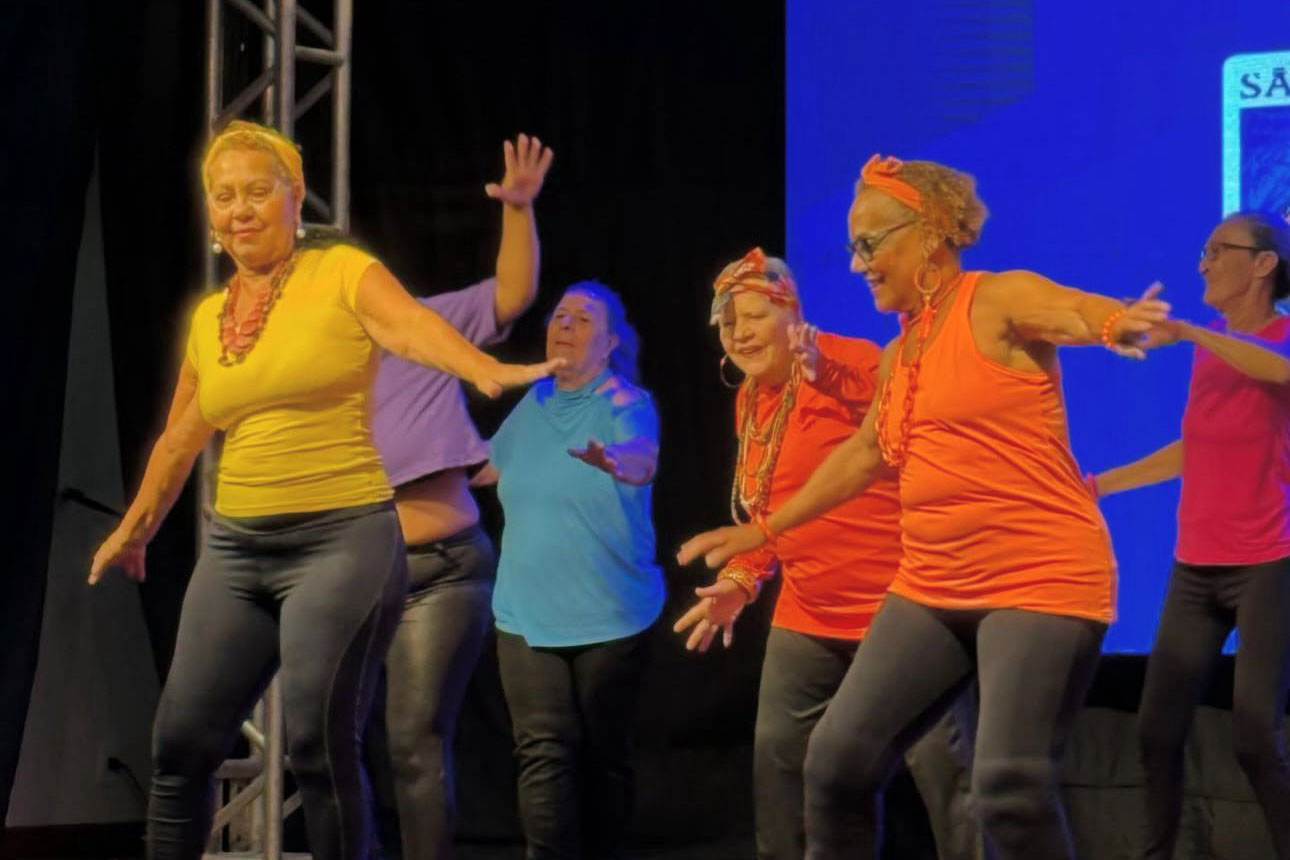 #PraTodosVerem: Imagens de mulheres idosas, felizes e dançando em cima do palco e a imagem seguinte mais de longe retratando o público prestigiando a apresentação dessas mesmas mulheres. Fim da Descrição.