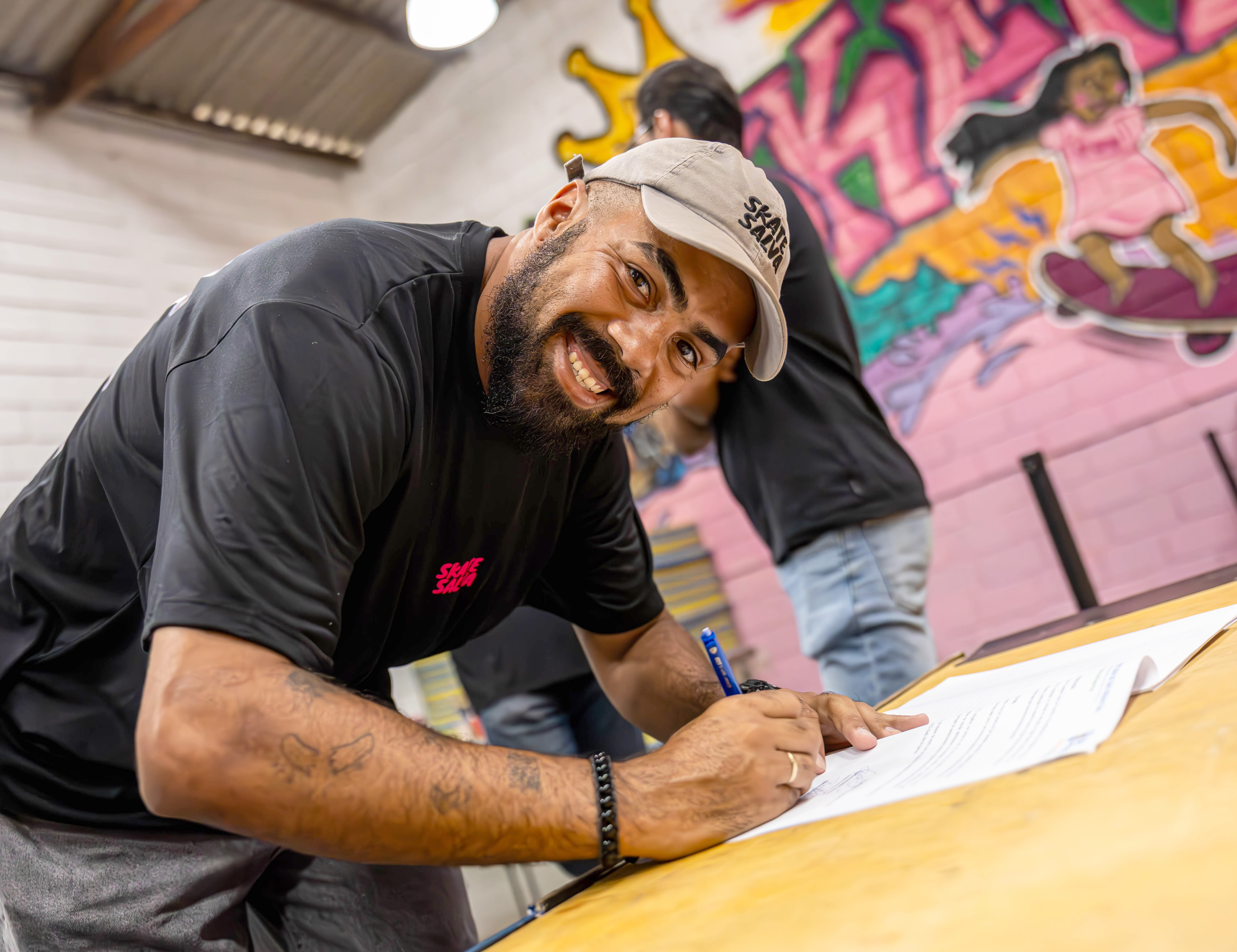 #PraTodosVerem: As fotos capturam cenas na sede da ONG Skate Salva, um skatepark interno caracterizado por murais de grafite extremamente coloridos e rampas de madeira. Em uma das imagens, o prefeito de São Sebastião, Reinaldinho Moreira, aparece de óculos e camiseta preta, inclinado, assinando documentos em cima de uma das rampas do local. Outras fotos mostram a interação da ONG, incluindo um grupo de cerca de 15 pessoas, muitas usando camisetas pretas, reunidas para uma instrução próxima a uma mini rampa, e um instrutor auxiliando o prefeito a andar de skate. O conjunto é concluído com uma foto do grupo em frente a um grande mural com a frase "Ninguém faz nada grande sozinho". Fim da descrição.