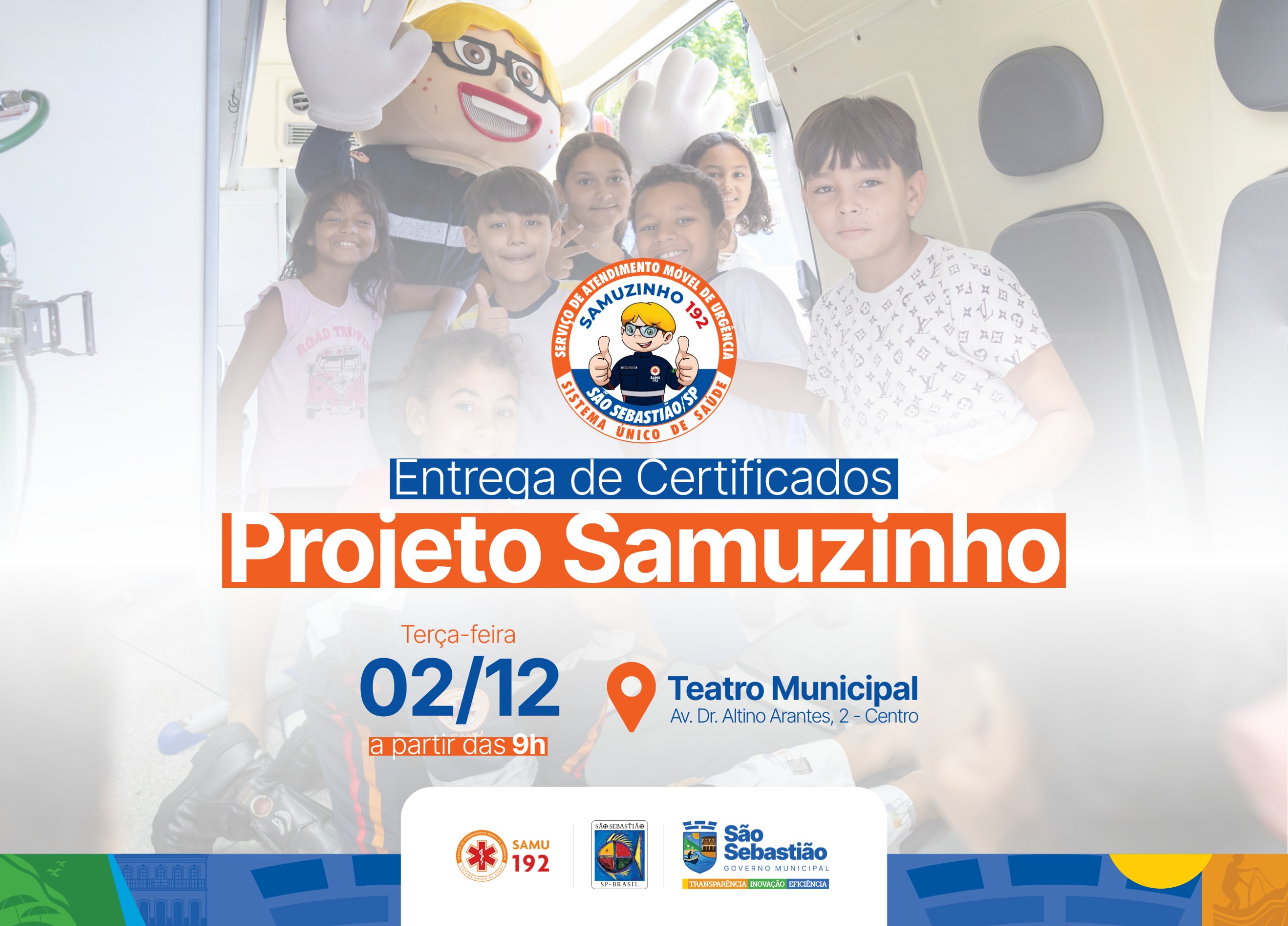 A Prefeitura de São Sebastião, por meio das secretarias da Educação (Seduc) e Saúde (Sesau), e do Serviço de Atendimento Móvel de Urgência (SAMU 192), realiza na próxima terça-feira (2/12), às 9h, a entrega dos certificados do Projeto Samuzinho, no Teatro Municipal.