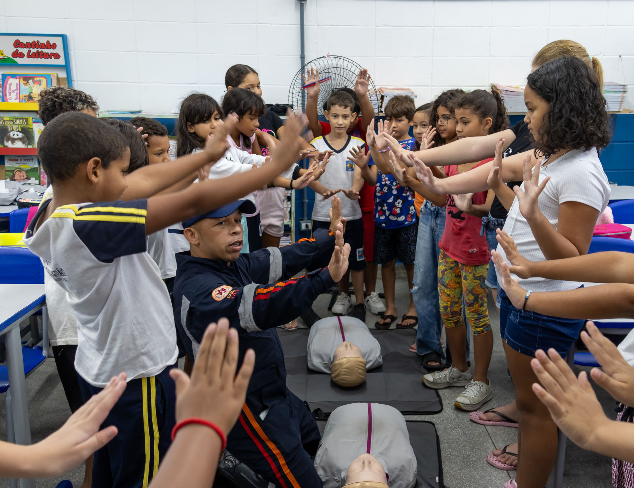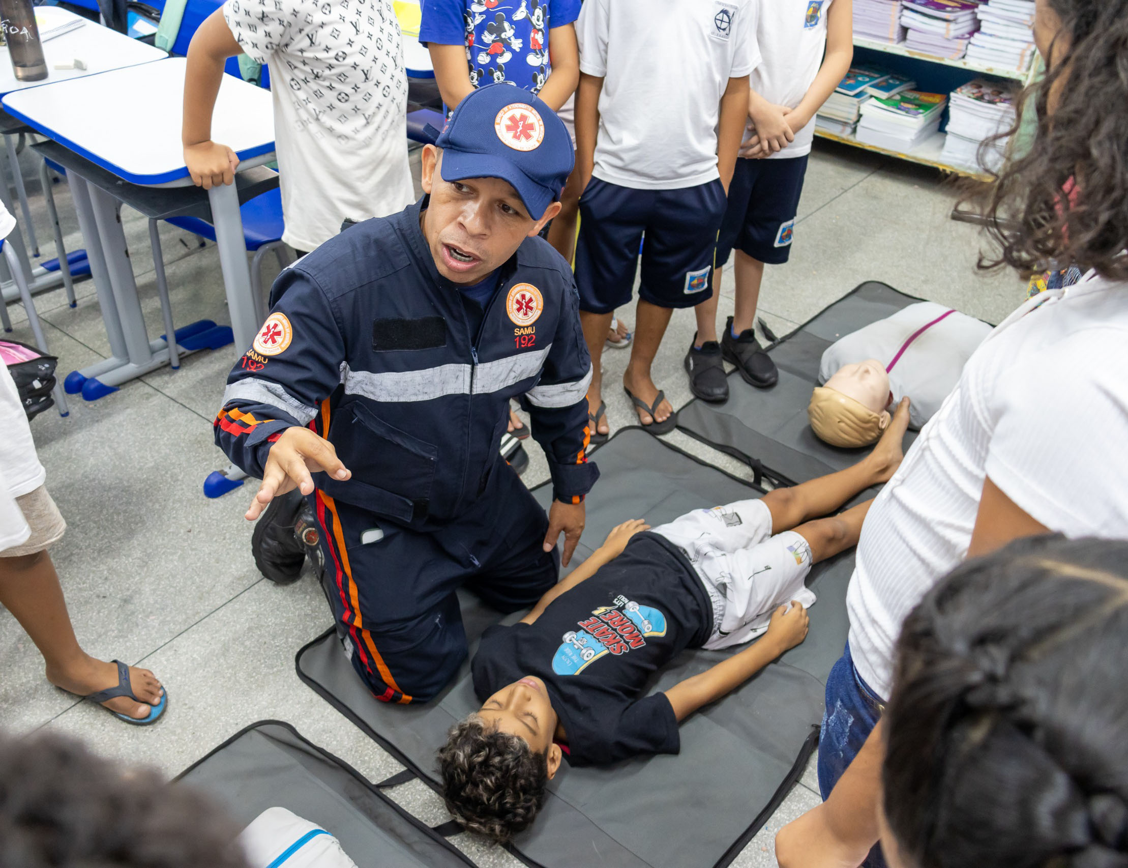 Durante as atividades, os estudantes aprendem, de forma prática e lúdica, como acionar o SAMU corretamente, a identificar situações de risco e a realizar ações básicas de primeiros socorros, como reanimação cardiopulmonar (RCP) e o que fazer em casos de engasgo e desmaios.