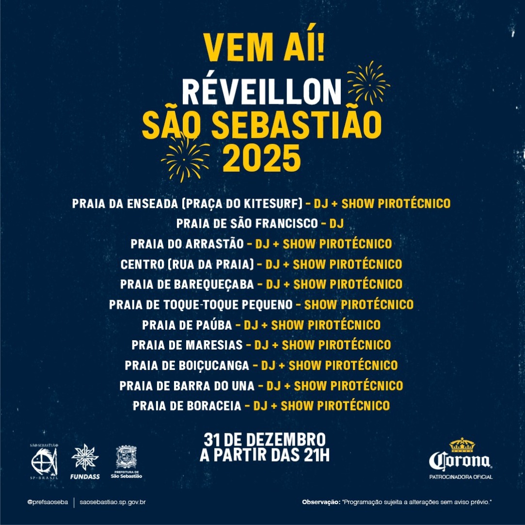 A Prefeitura de São Sebastião, por meio da Secretaria de Turismo (SETUR), com patrocínio da Corona, está preparando uma grande festa de Réveillon que promete agitar diversas praias de Costa Sul à Costa Norte do município.