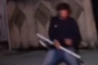 #PraTodosVerem: Duas imagens em sequência. A primeira mostra uma pessoa com aparência masculina, em ambiente externo à noite, vestindo blusa escura e calça jeans, segurando um objeto comprido branco com ambas as mãos, em postura agressiva. A imagem está desfocada. Na outra imagem, um policial municipal de costas, usando gorro preto e jaqueta azul, aparentemente imobilizando ou conduzindo outra pessoa, também de costas, próximo a um veículo. A cena é noturna e iluminada por luz artificial. Fim da descrição.