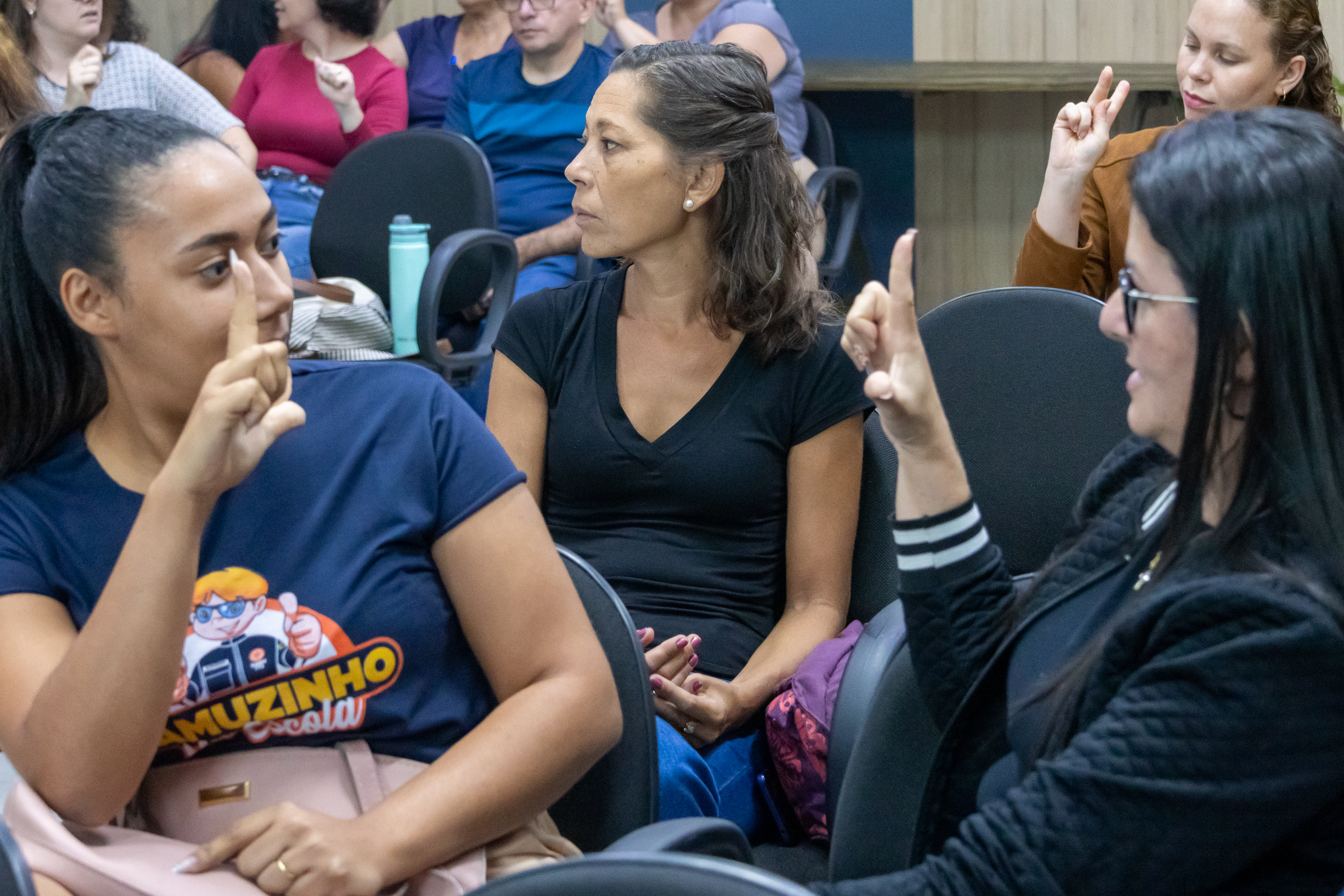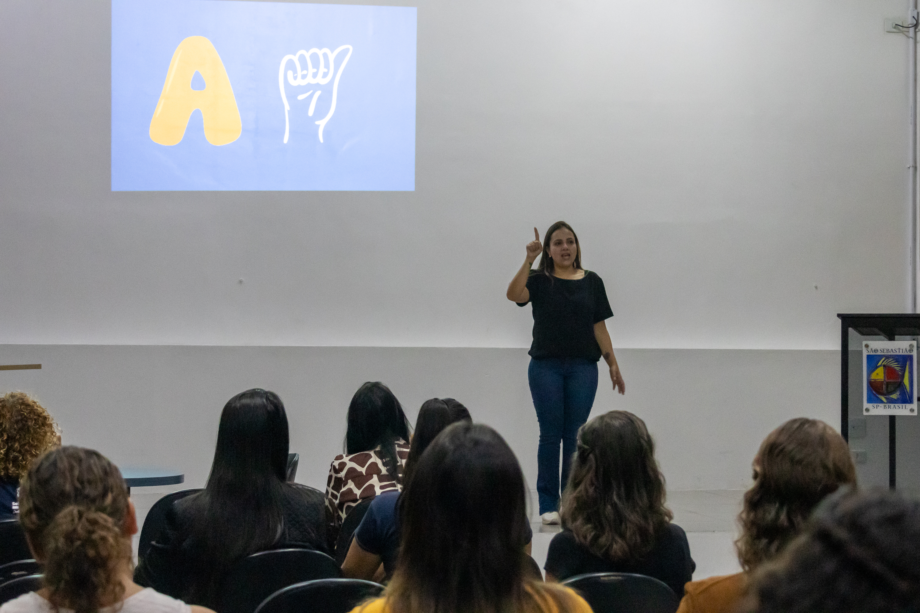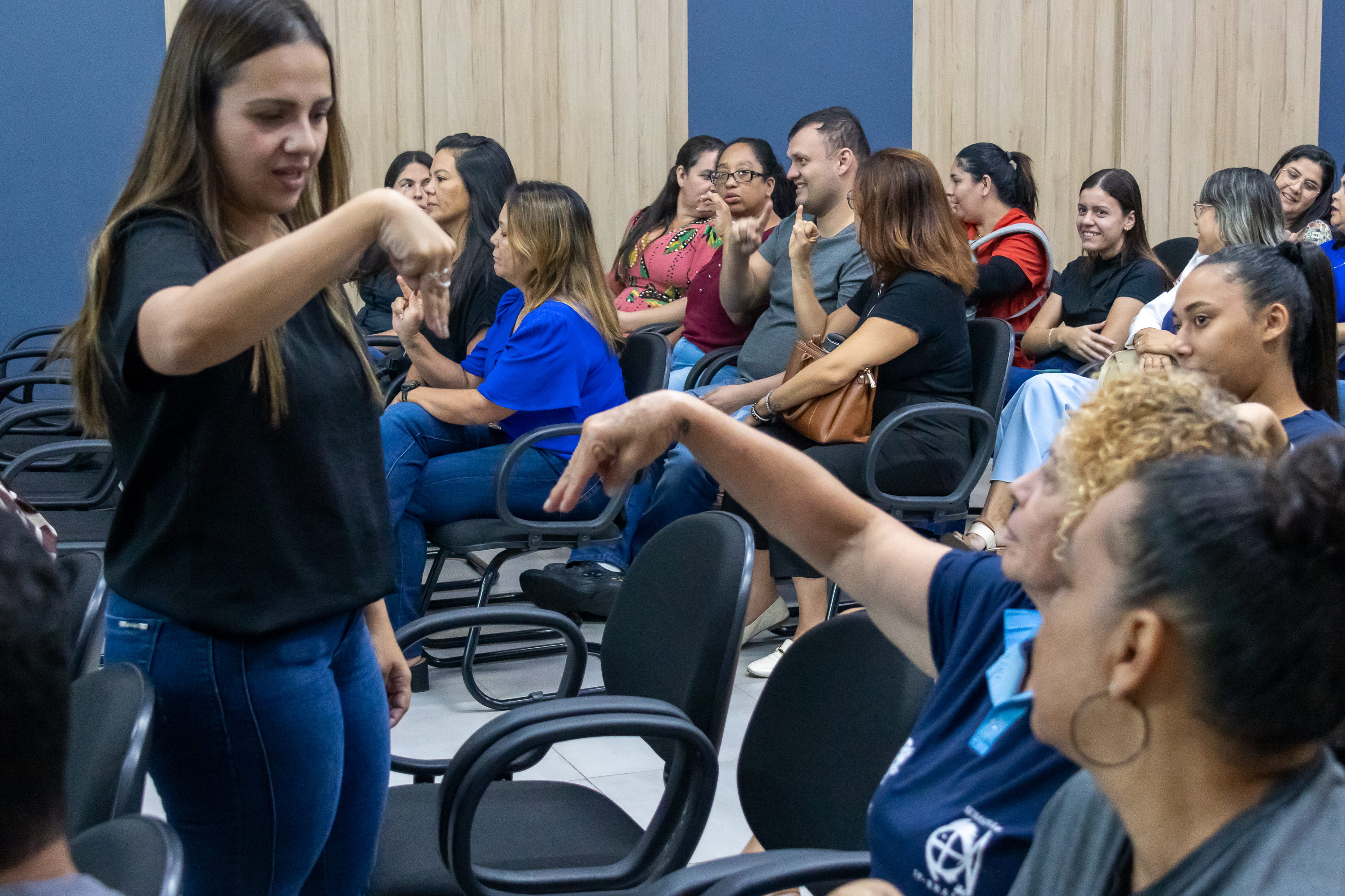 #PraTodosVerem: As imagens mostram momentos de um curso de Libras (Língua Brasileira de Sinais) oferecido para servidores públicos. Na primeira foto, a instrutora está em pé diante da sala cheia, explicando enquanto os participantes acompanham sentados. Na segunda imagem, a instrutora e uma aluna trocam sinais de forma próxima e interativa, com outros servidores também praticando ao fundo. Na terceira foto, a instrutora aparece sozinha no palco, sinalizando a letra “A” com uma projeção ao fundo que exibe a mesma letra acompanhada do desenho da mão correspondente. Já na quarta imagem, duas mulheres sentadas interagem utilizando sinais, enquanto uma terceira, ao centro, observa com atenção. Todas as fotos foram feitas em uma sala de aula ampla, com paredes decoradas em madeira clara e azul escuro, e o público é majoritariamente composto por mulheres.