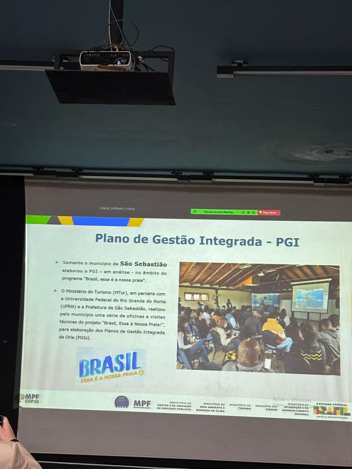 #PraTodosVerem: imagem mostra um grupo de aproximadamente 40 pessoas posando para uma foto em um auditório. Ao fundo, há uma grande tela de projeção exibindo a frase "Capacitação em Gestão de Praias", com o logotipo do MPF e a marca "COP30". As pessoas estão sorrindo, posicionadas em frente à tela, e há dois banners laterais com informações do evento. A segunda imagem é um slide projetado com o título "Plano de Gestão Integrada – PGI", mencionando o município de São Sebastião e o projeto "Brasil, Essa é a Nossa Praia", com uma foto de uma oficina com várias pessoas assistindo a uma apresentação. A terceira imagem mostra outro slide com o título "Termo de Adesão à Gestão de Praias – TAGP", listando municípios com adesão deferida, pendente e solicitada, além de um mapa com cores indicando a situação de cada região litorânea do Estado de São Paulo.