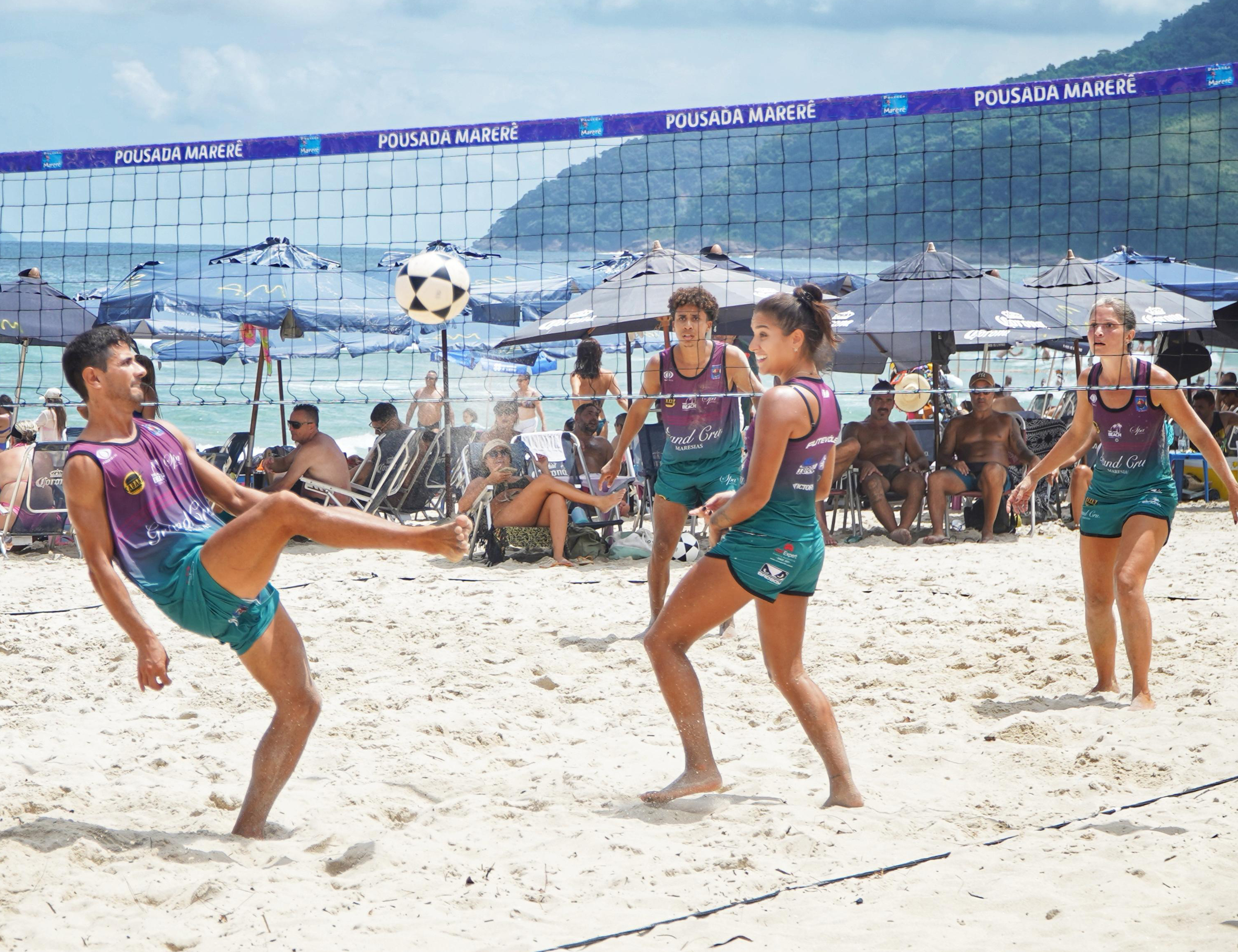 #PraTodosVerem: Esta série de imagens captura a energia vibrante de uma competição de futevôlei em uma praia movimentada, repleta de espectadores e guarda-sóis. Atletas demonstram habilidade e concentração em diferentes momentos do jogo, como um jogador chutando acrobaticamente a bola sobre a rede, uma jogadora se preparando para um passe e outra atleta observando atentamente a trajetória da bola cabeceada por seu parceiro. Fim da descrição.