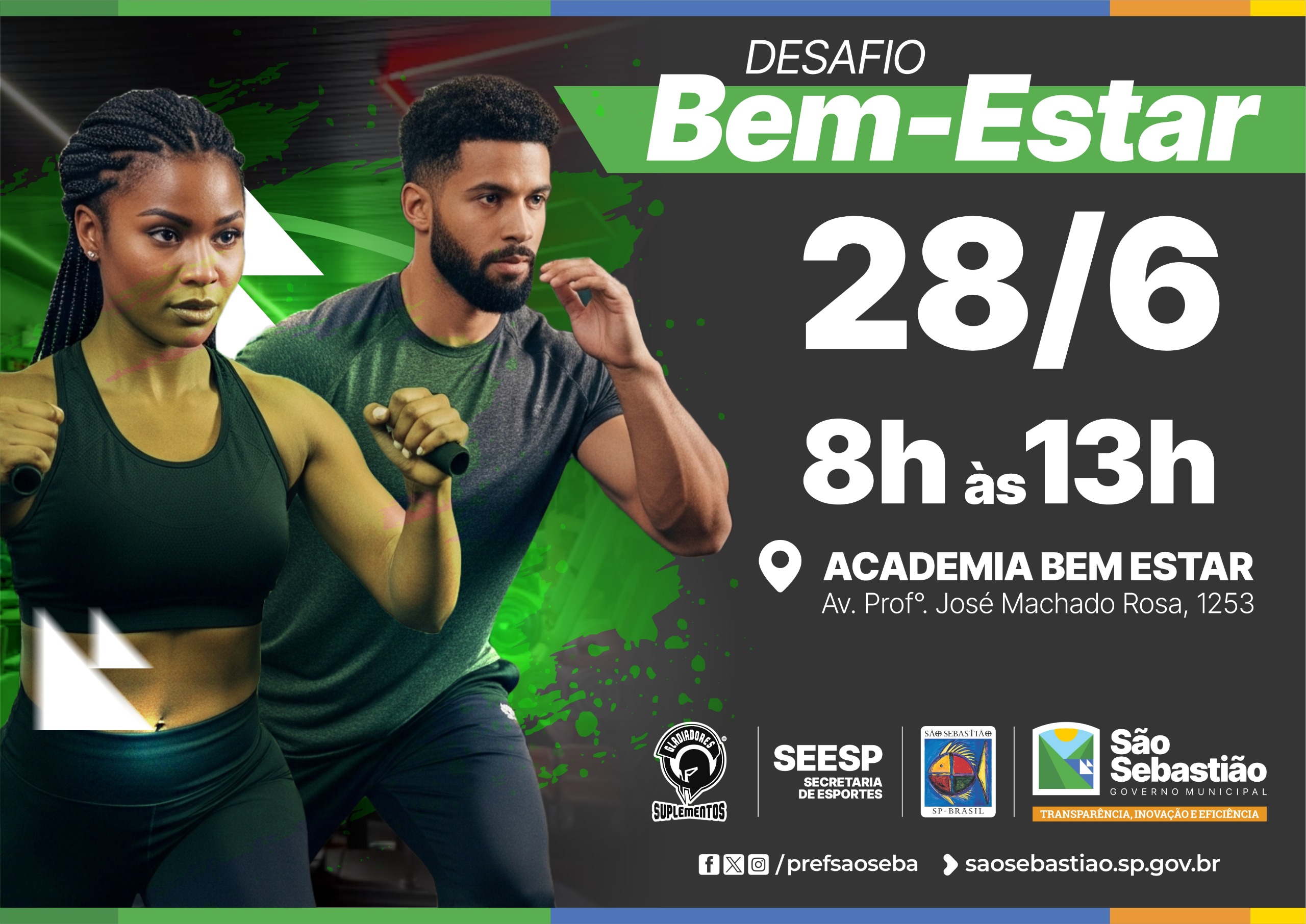 #PraTodosVerem: arte institucional colorida e vibrante do evento "Desafio Bem-Estar", que ocorrerá no dia 28 de junho, das 8h às 13h, na Academia Bem Estar, localizada na Av. Prof. José Machado Rosa, 1253. À esquerda da imagem, há uma mulher negra e um homem negro, ambos vestidos com roupas esportivas, em posição de exercício físico, transmitindo energia e movimento. O fundo tem tons de verde com efeitos gráficos modernos. À direita, em destaque, estão as informações do evento com letras grandes e brancas sobre um fundo escuro. Na parte inferior, aparecem os logotipos da Gladiadores Suplementos, da Secretaria de Esportes de São Sebastião (Seesp), da Prefeitura de São Sebastião, e os ícones de redes sociais com o @prefsaoseba e o site saosebastiao.sp.gov.br. As imagens seguintes são de pessoas se exercitando na Academia Bem-Estar. Fim da descrição.