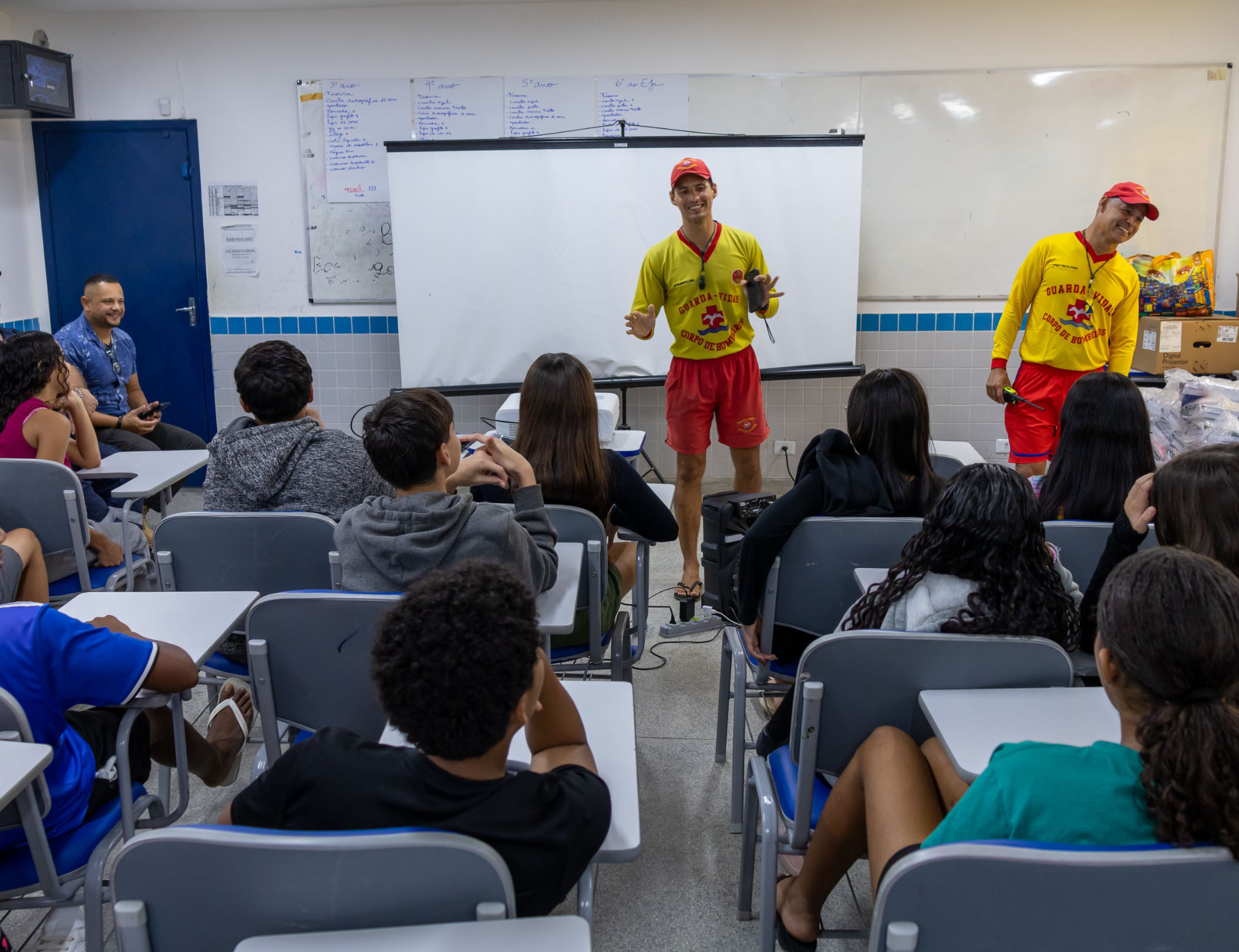 Desenvolvido no contraturno escolar, o projeto capacita estudantes dos anos finais do Ensino Fundamental, com idades entre 11 e 16 anos, para reconhecer e agir em situações de emergência em ambientes terrestres e aquáticos. Os jovens aprendem, ainda, a identificar riscos associados à praia, ao mar e às piscinas, além de receberem orientações sobre comportamento seguro em áreas de lazer.