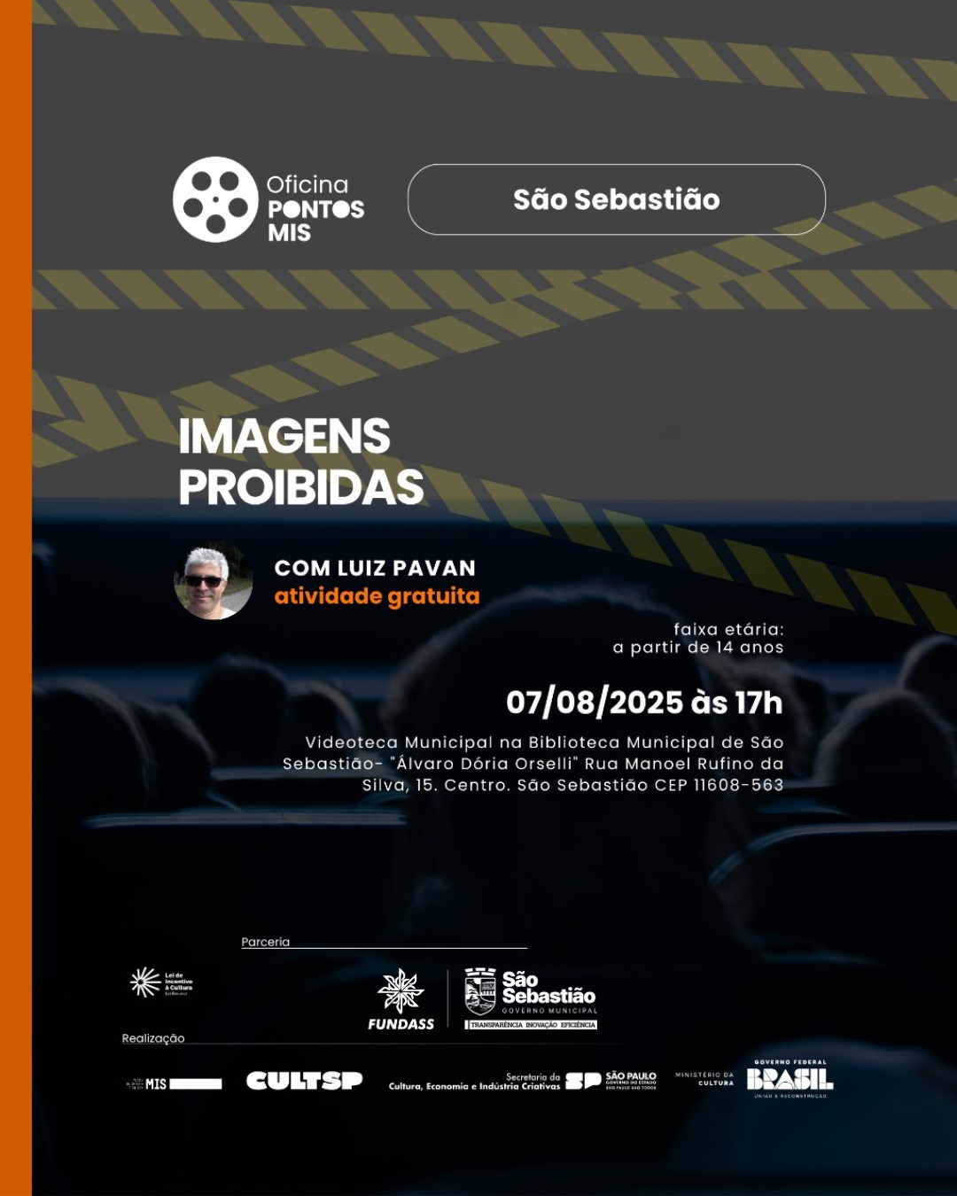 A Prefeitura de São Sebastião, por meio da Fundação Educacional e Cultural ‘Deodato Sant’Anna’ (Fundass), em parceria com a Secretaria de Cultura e Economia Criativa do Estado de São Paulo e o Pontos MIS, promove gratuitamente a oficina ‘Imagens Proibidas’, ministrada pelo músico e produtor Luis Carlos Pavan.
