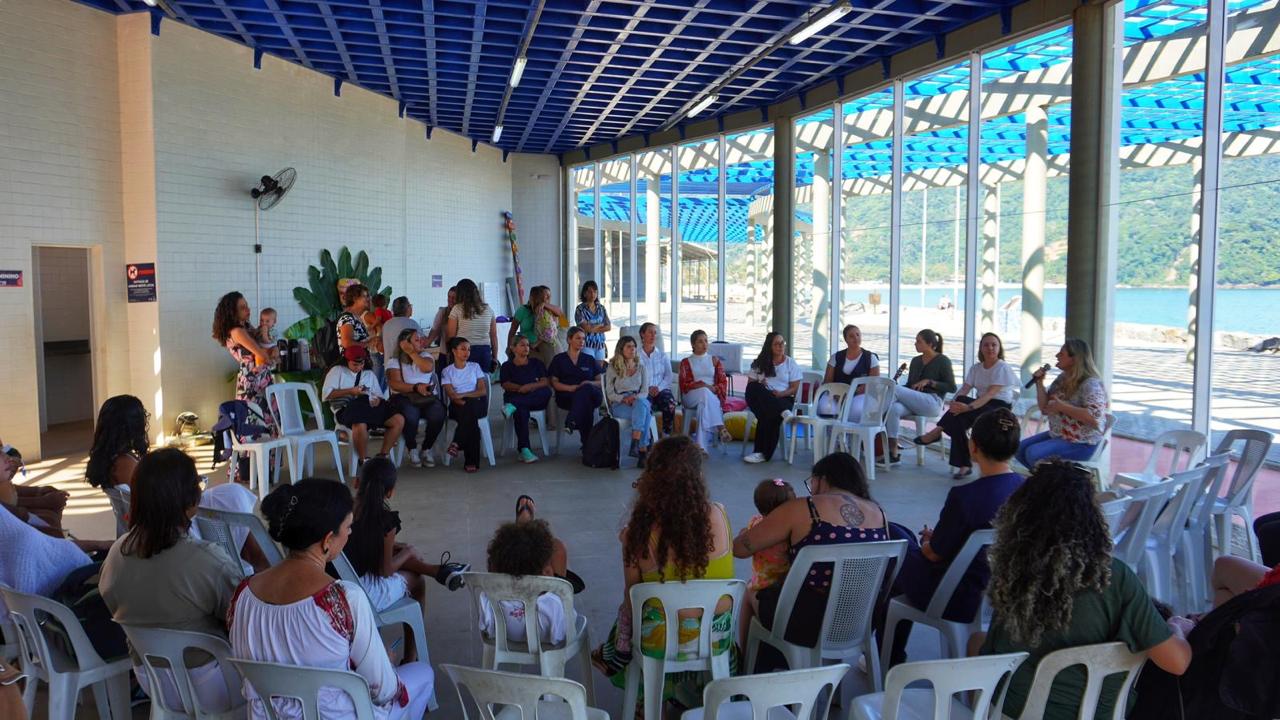 #PraTodosVerem: as imagens mostram encontros repletos de afeto e acolhimento, com a presença de muitas mulheres, bebês, crianças e profissionais reunidos em diferentes ambientes, como áreas externas à beira-mar e espaços cobertos. Em clima de integração e celebração, os registros capturam momentos de partilha, rodas de conversa, amamentação e convivência comunitária, destacando o cuidado, o apoio mútuo e a valorização da maternidade. Fim da descrição.